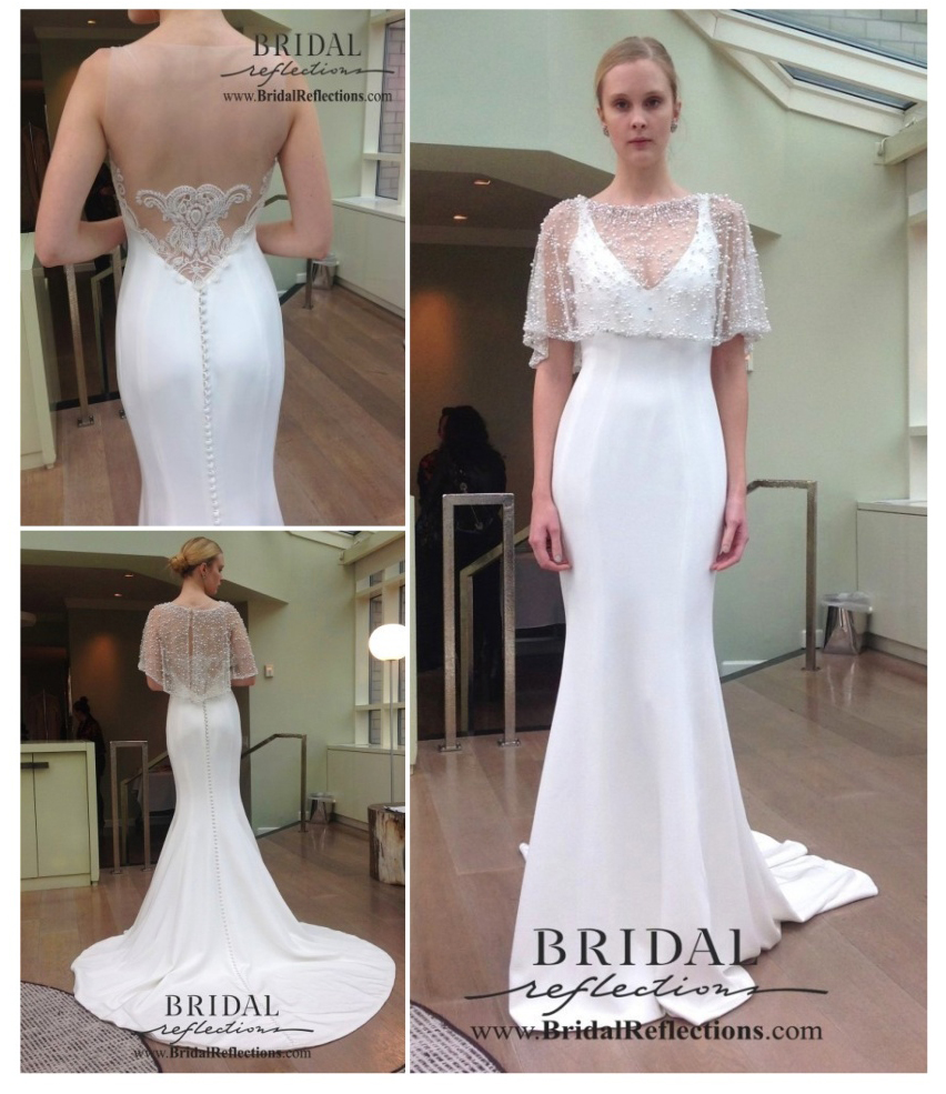 “Limoges” Sleeveless sheath gown made with luxurious silk crepe and finished with are deco inspired beading at illusion back. Adored with covered buttons continuing throughout back of gown. Paired with beaded pearl Bolero.