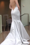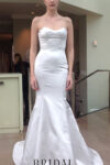 “Paris” Strapless silk peau de soie gown with fit-to-flare silhouette and dramatic low v back. Accessorized with swarovski and pearl engineered beaded illusion cape. Finished with elegant sating bow at wait.