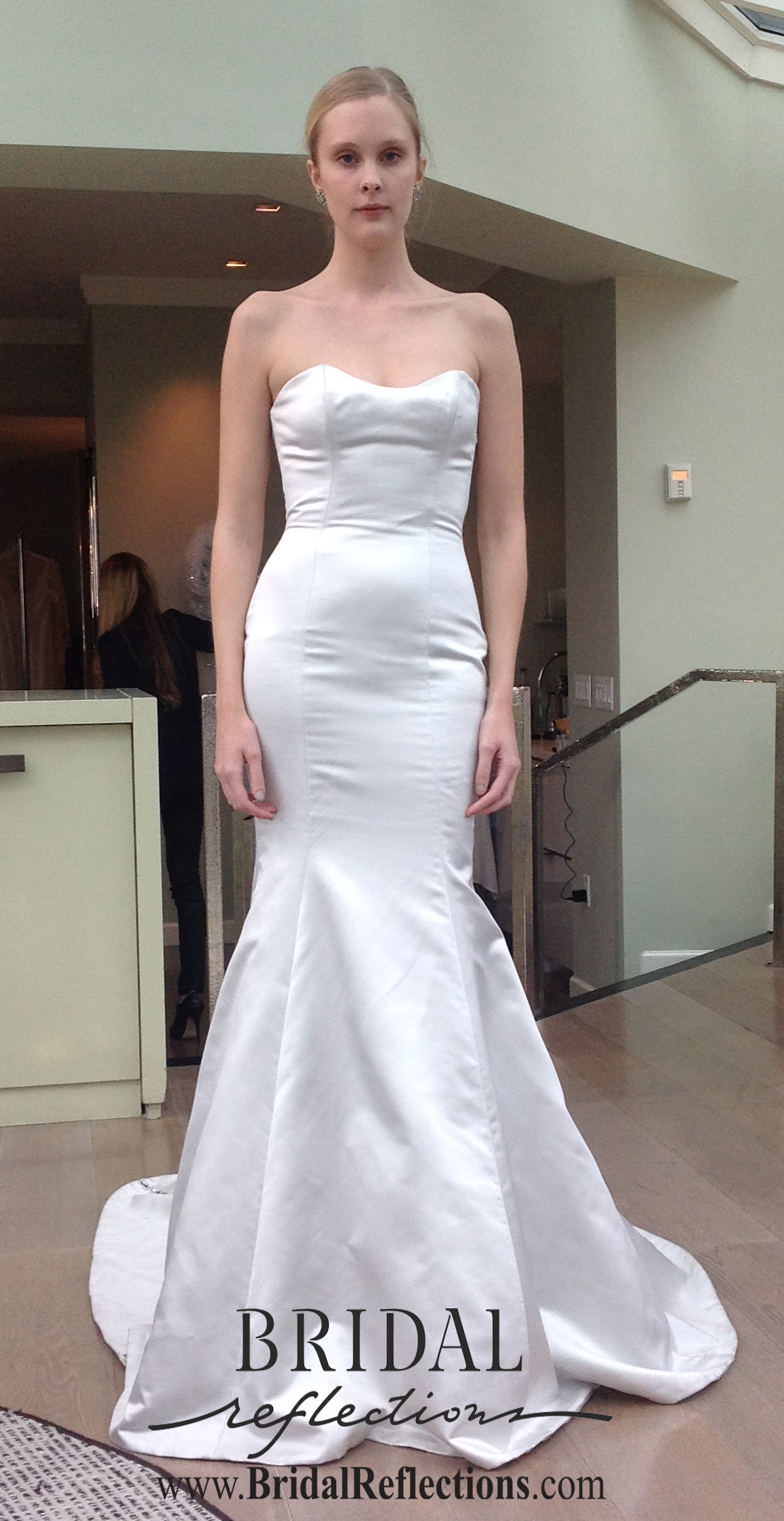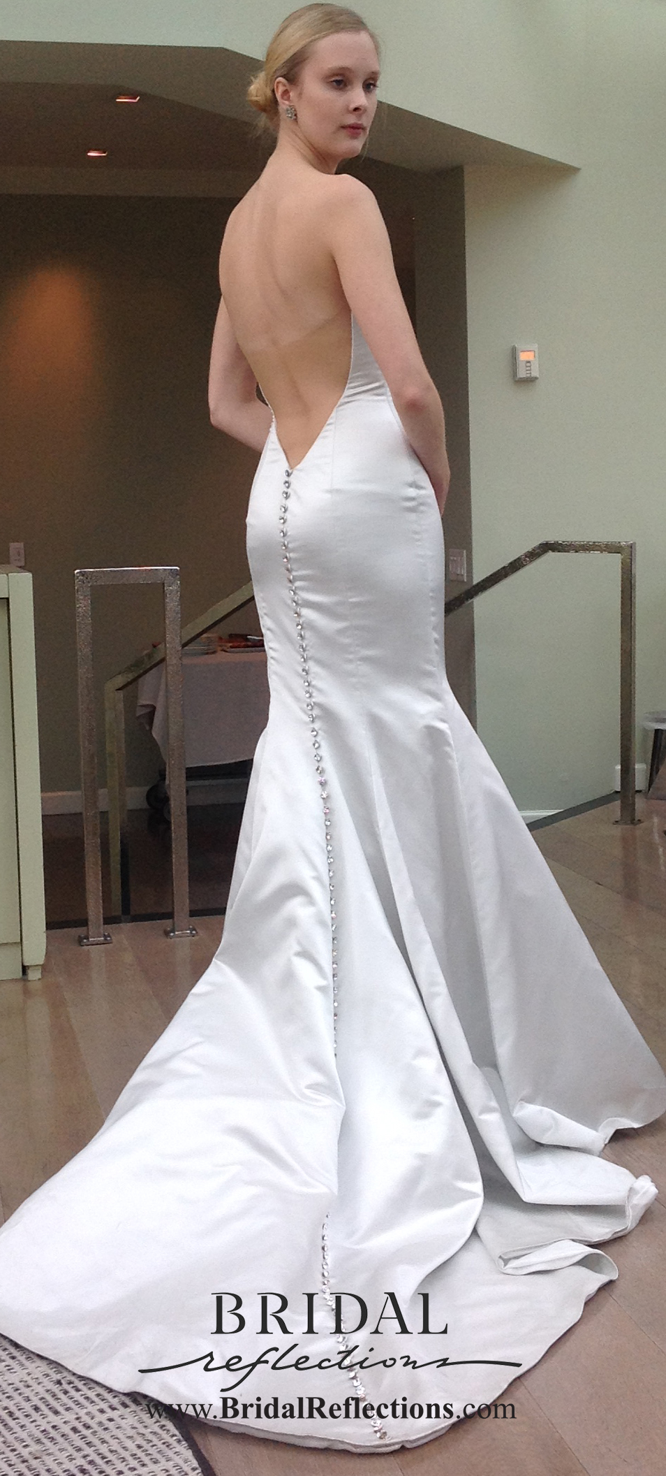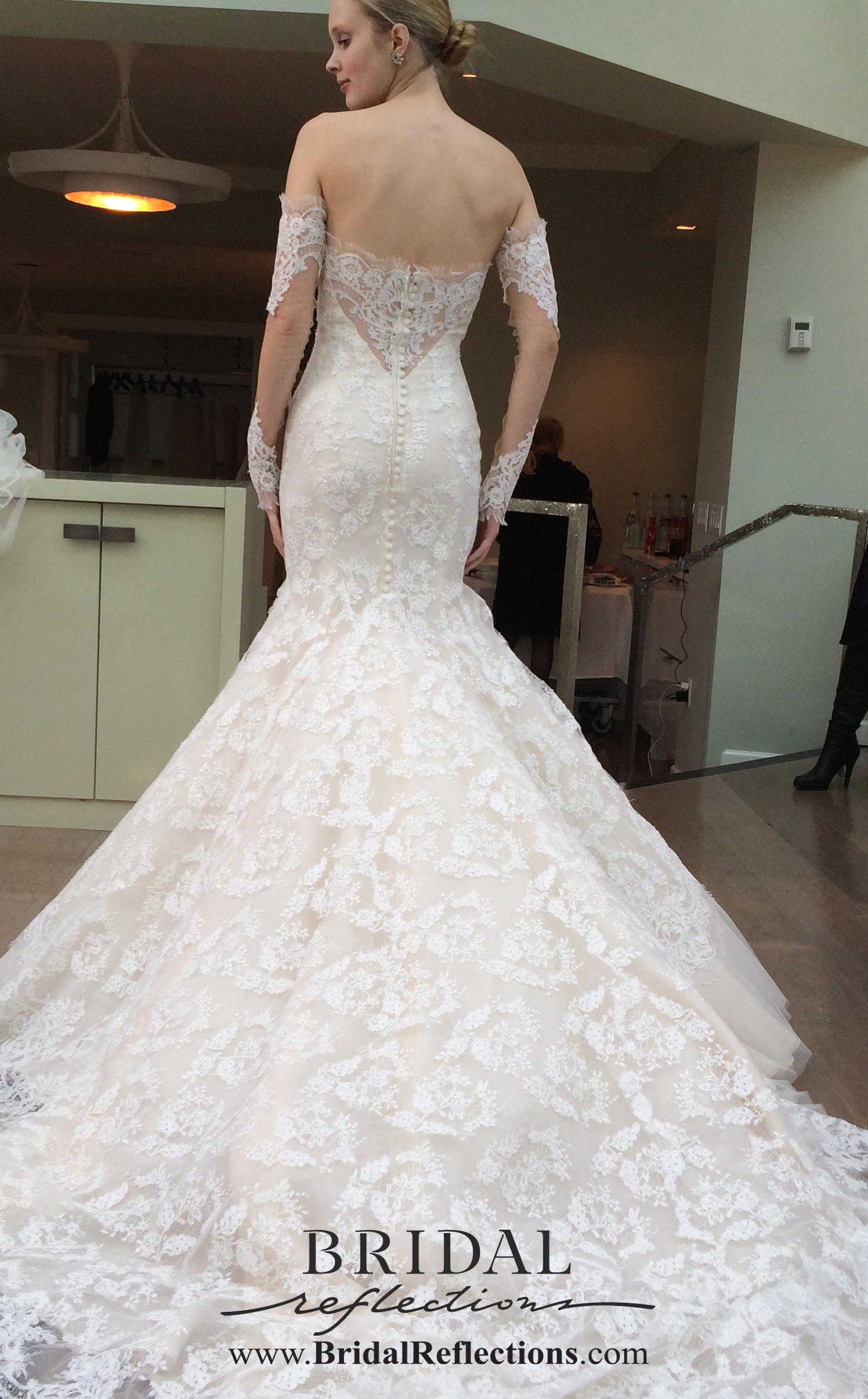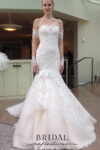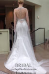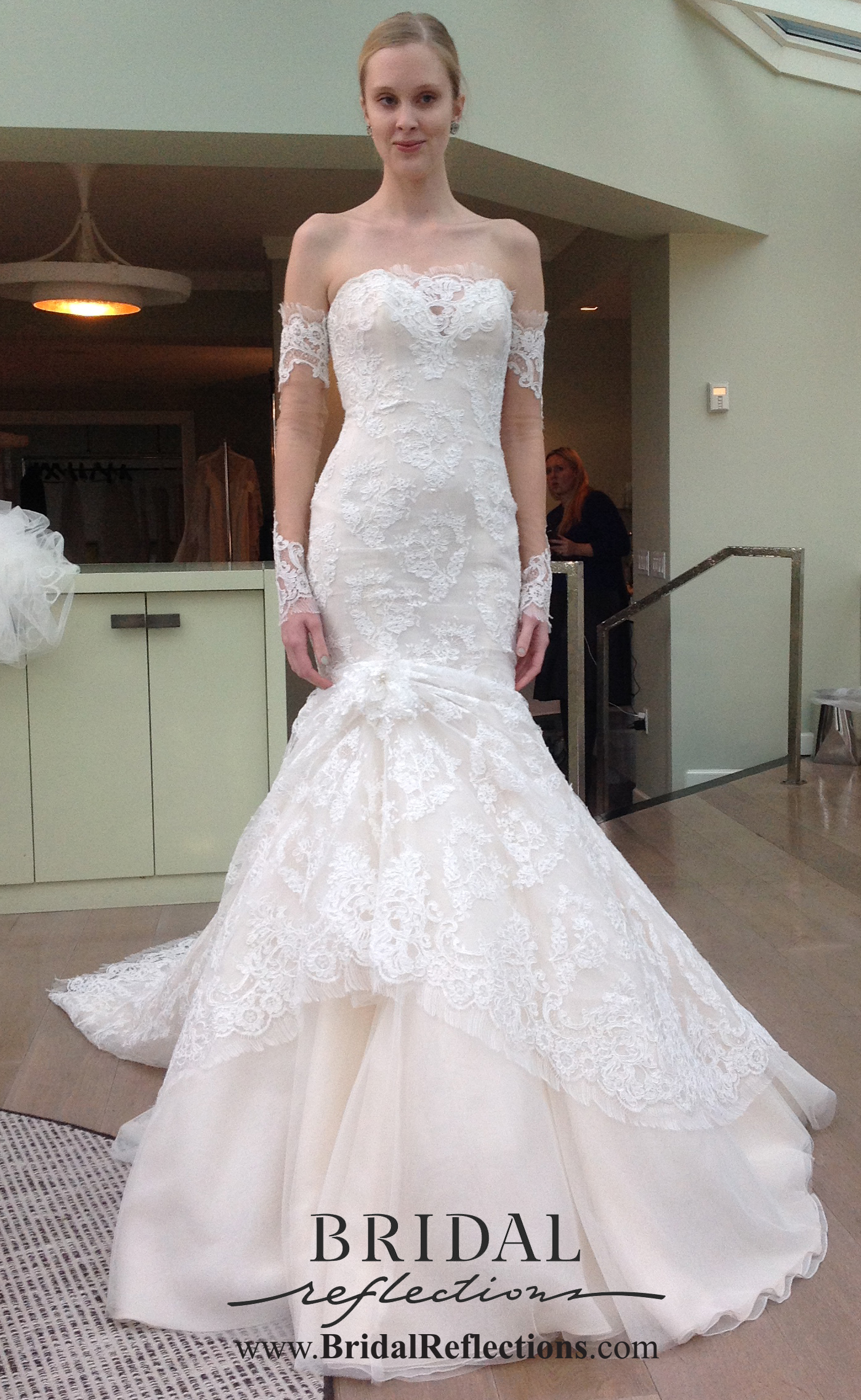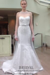 “London” Strapless alencon ace gown with deep v neckline and elegant trumpet silhouette with romantic pick up at skirt. Finished with rich scalloped neckline. Gown features dramatic illusion back and extended cathedral length train.