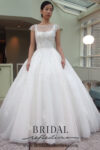 “Cologne” Sleeveless vanilla pink tulle ball gown with elegant scooped neckline, beaded pearl illusion and bateau neckline and low back. Skirt hemline adorned with delicate beaded lace appliques.