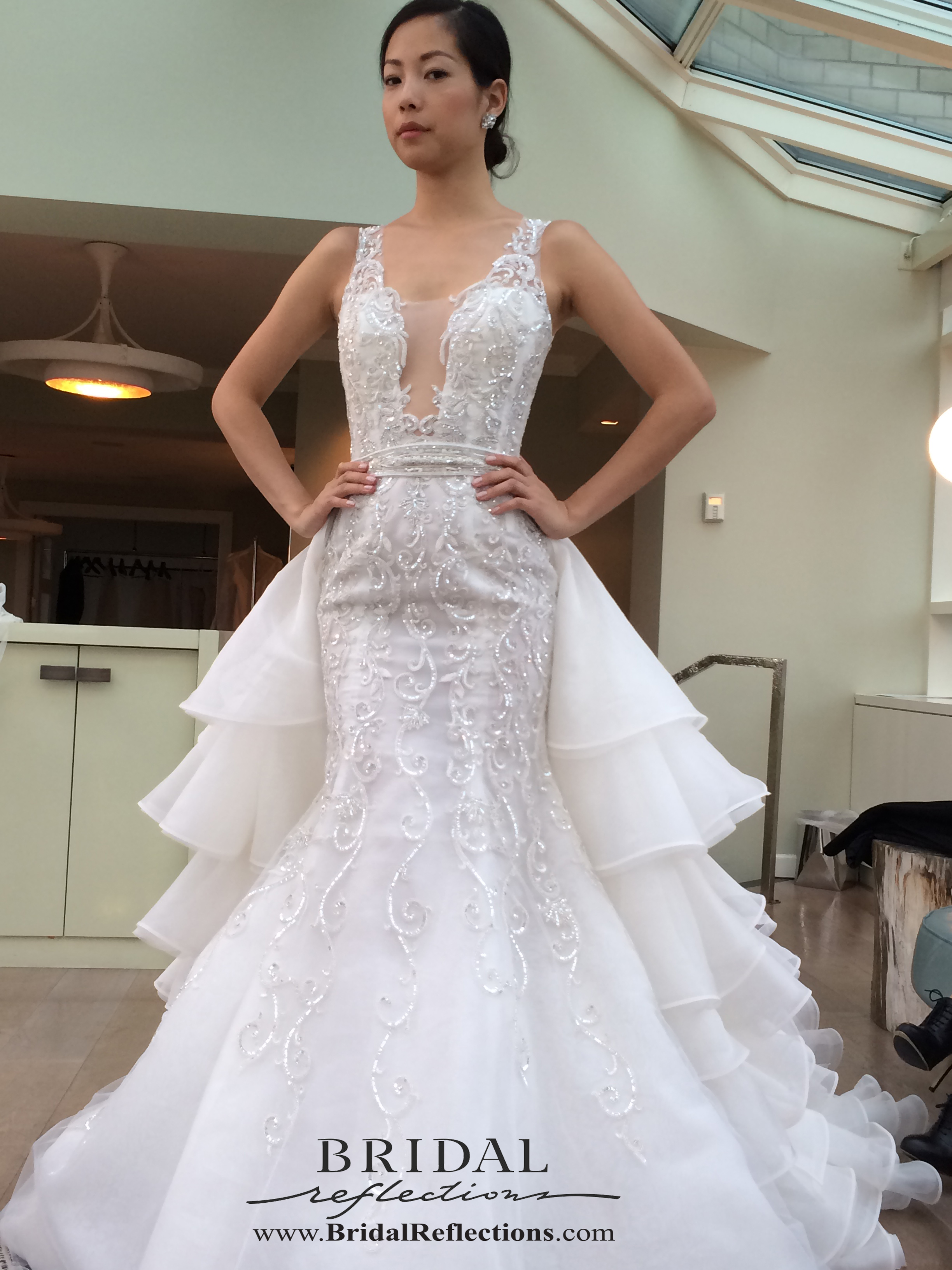 “Salerno” Sleeveless fit-to-flare silhouette with elegant palette beading and embroidery throughout gown features a dramatic plunging illusion neckline and beaded build up at at back. Paired with detachable cascading silk organza ruffled train.