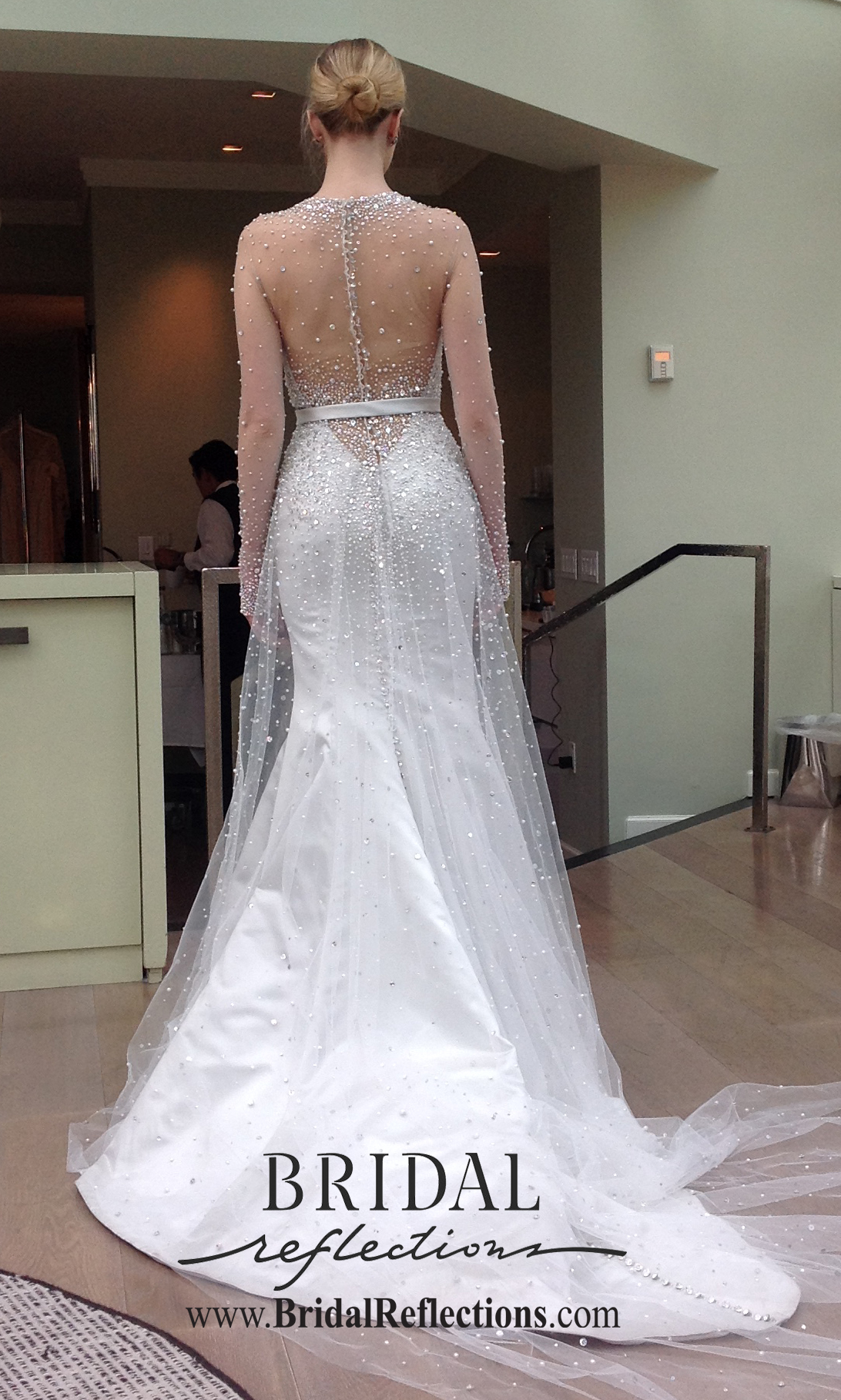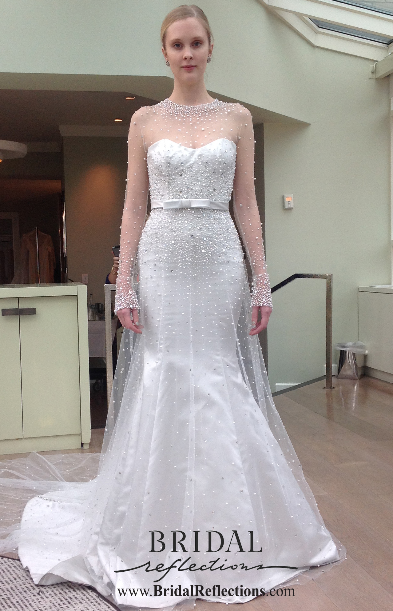 Gown features a dramatic sheer illusion bodice, scalloped plunging V neckline and delicate illusion at shoulders.