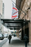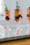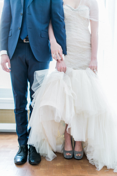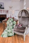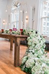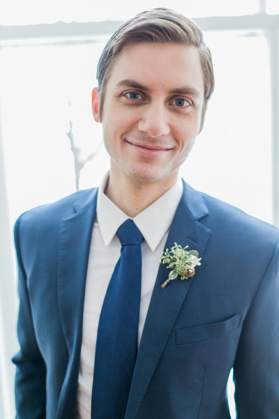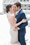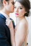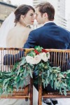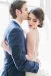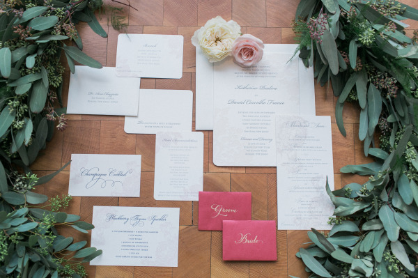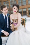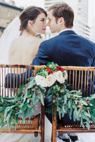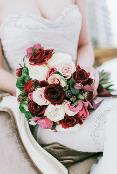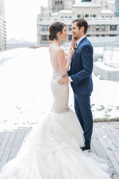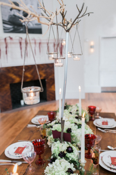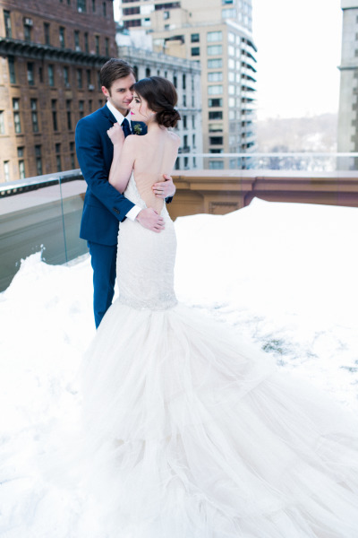 “When the opportunity arose to be the first team to create a styled shoot in the newly renovated event space at Carnegie Hall, we were over the moon! With such a beautiful, historic landmark as our backdrop and fresh snow covering the gorgeous terrace, we couldn’t have been more delighted with this winter shoot. Using Marsala, the pantone color of 2015 as our inspiration, we created a chic palette of blush tones, ruby reds and gorgeous airy greens that influenced every detail in the shoot. Chantilly lace and full layers of tulle dressed our model in elegance, while a custom fit navy suit, with character from head to toe, completed the groom’s tailored look. Inside, lush hydrangea florals wove their way around vintage place settings and cascaded over our barn wood table to create elegant drama. Upon each plate, a delicately placed card with gorgeous gold calligraphy and champagne cocktails beautifully garnished with thyme and blackberry, pulled the color palette together.”