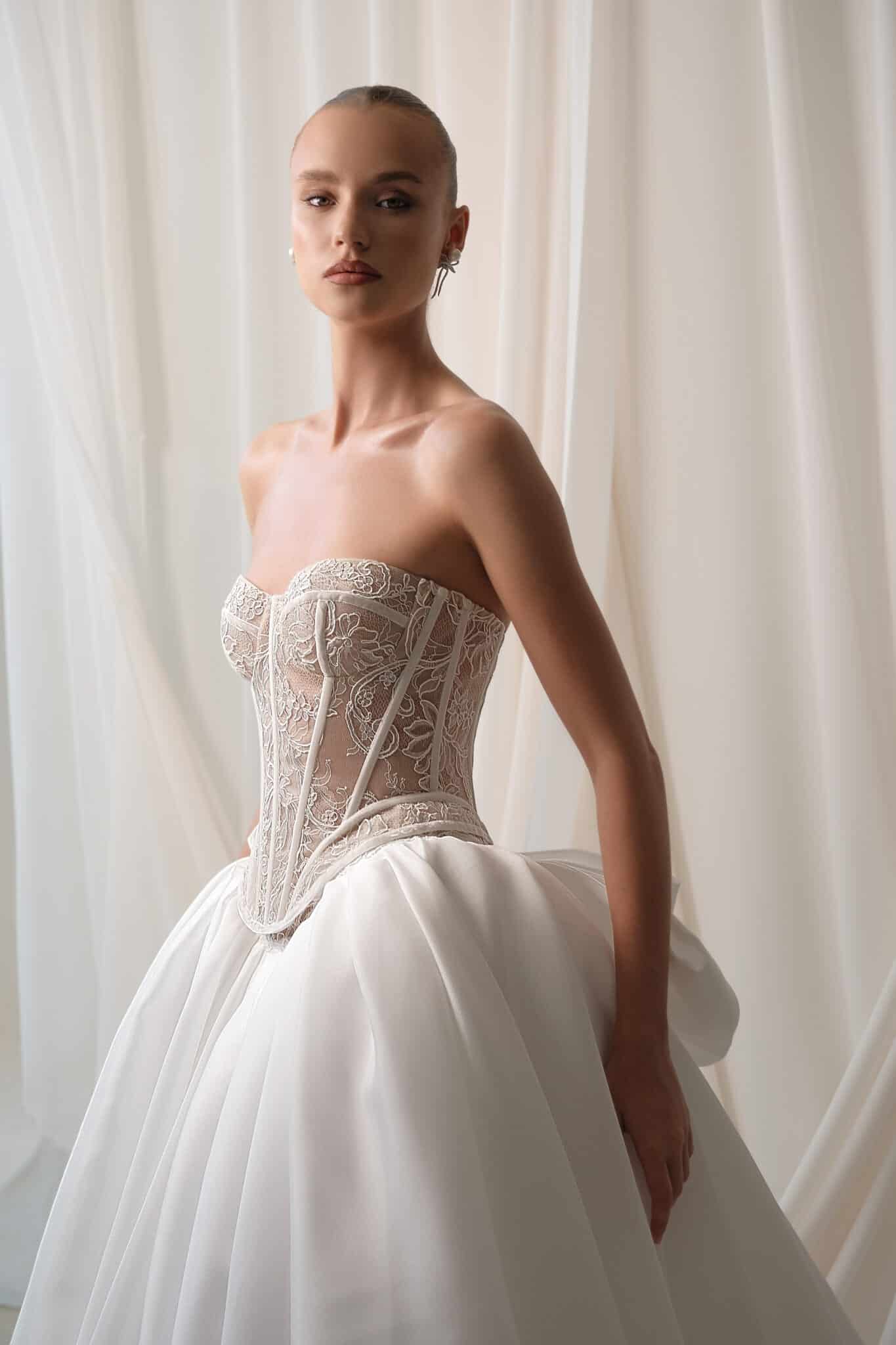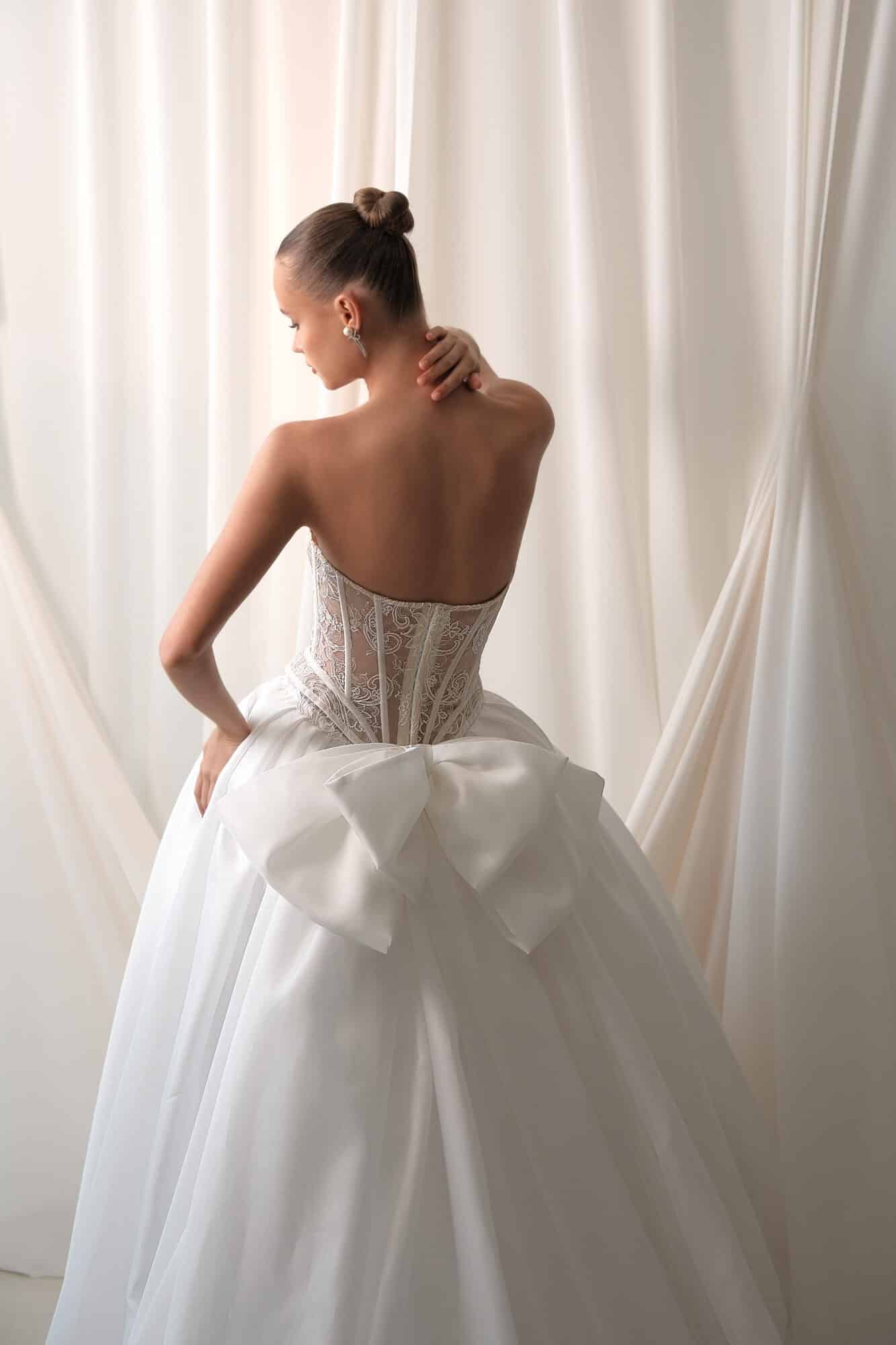 Aida by Adam Zohar is a striking fusion of architectural elegance and delicate femininity. This couture ball gown features a structured sheer corset bodice adorned with intricate floral embroidery and defined boning, offering both modern edge and timeless romance. The strapless neckline enhances the décolletage while the voluminous, softly draped skirt adds ethereal movement with every step. A dramatic oversized bow at the back provides a playful yet sophisticated finish, perfect for the fashion-forward bride who dreams of making a statement from every angle.