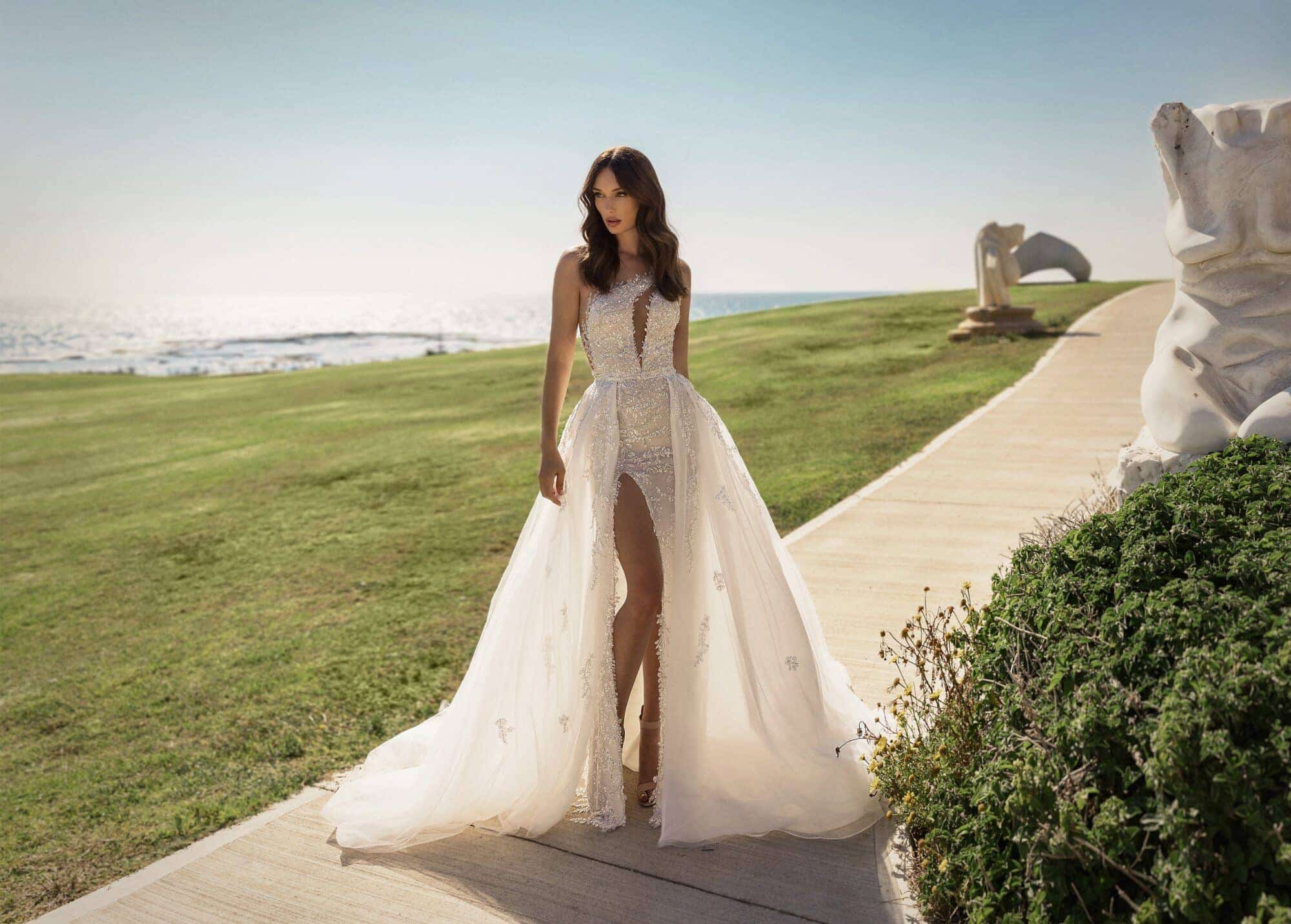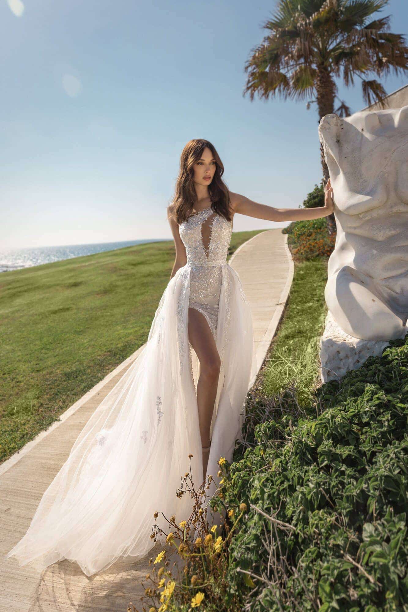 Fully beaded one shoulder illusion cutout gown featuring a high slit with sweep train. Pair with optional detachable layered tulled overskirt.