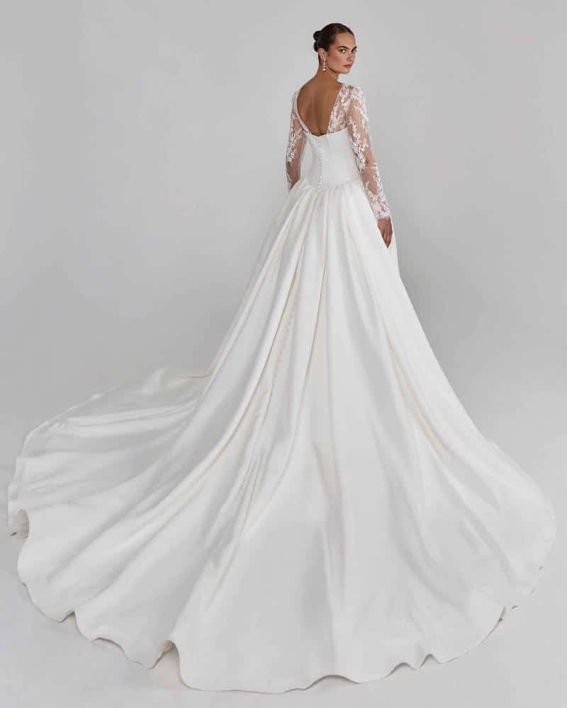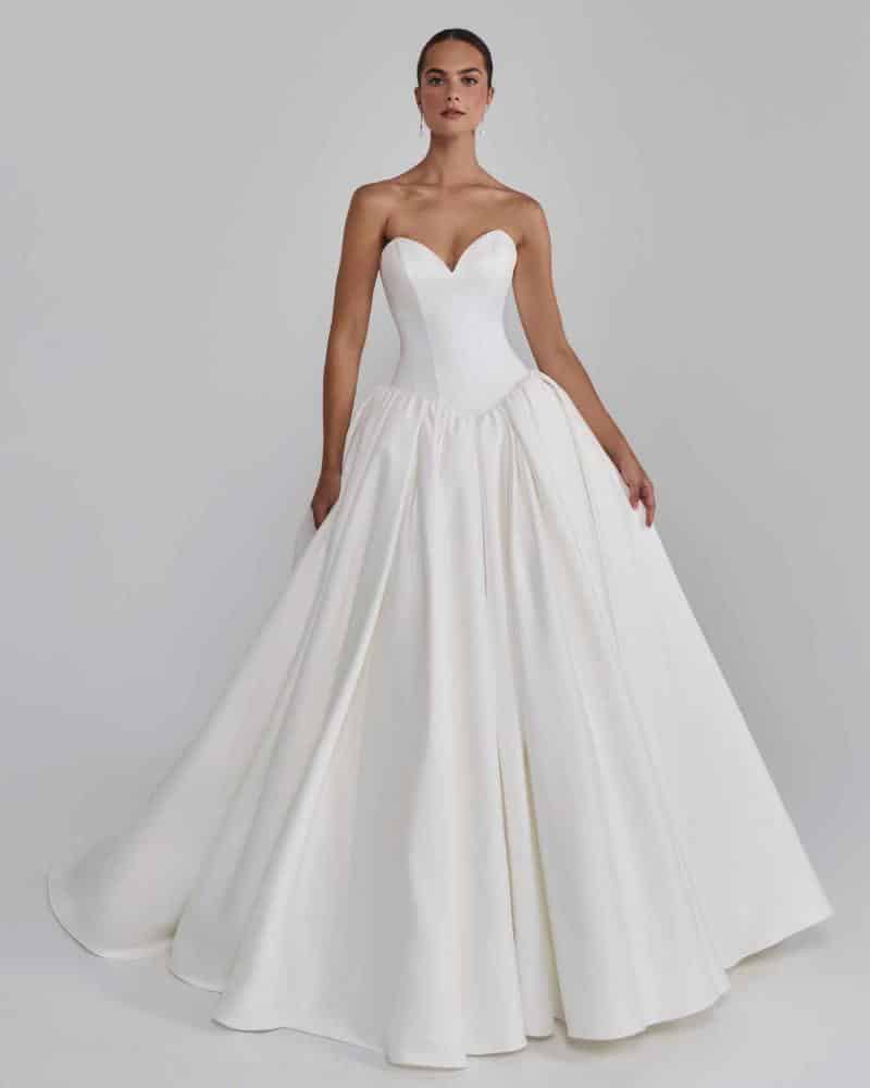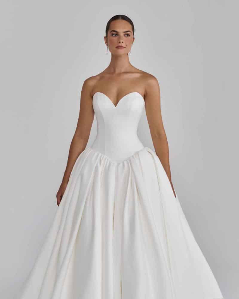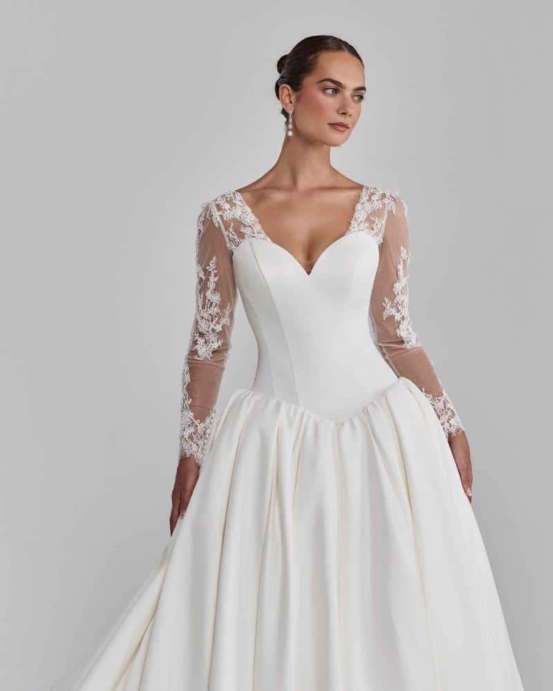 Contessina is the kind of A line wedding dress that makes winter weddings feel like a fairytale. Her sweetheart neckline can be worn strapless or with sheer lace sleeves, giving brides the flexibility to choose tradition or a modern edge. The drop basque waistline sculpts the torso before unfolding into a voluminous skirt and sweeping train, designed to turn every step into a moment. With the elegance of her jacket and matching veil, she transforms from classic sophistication to evening glamour in an instant.