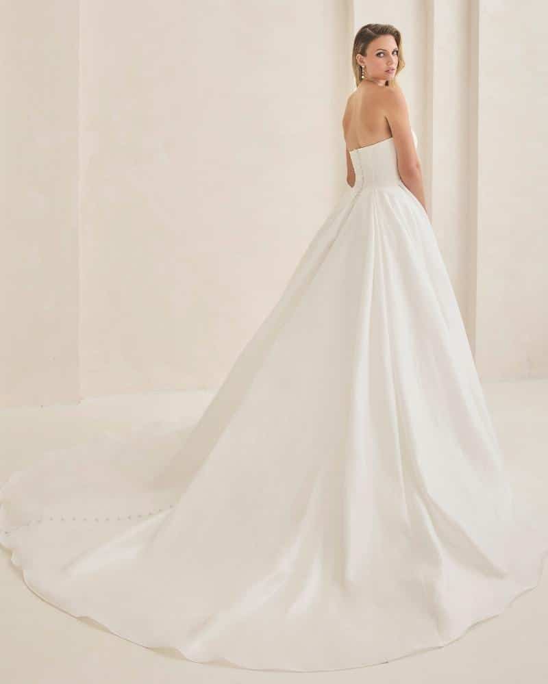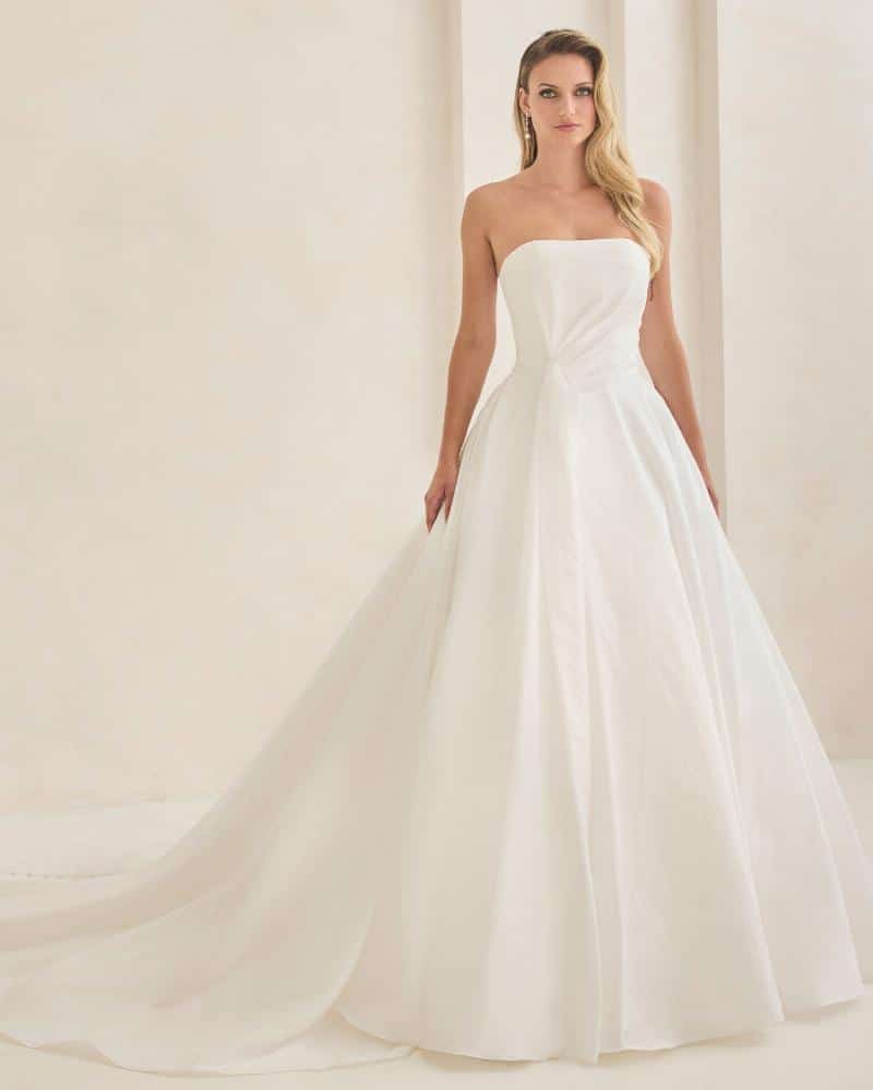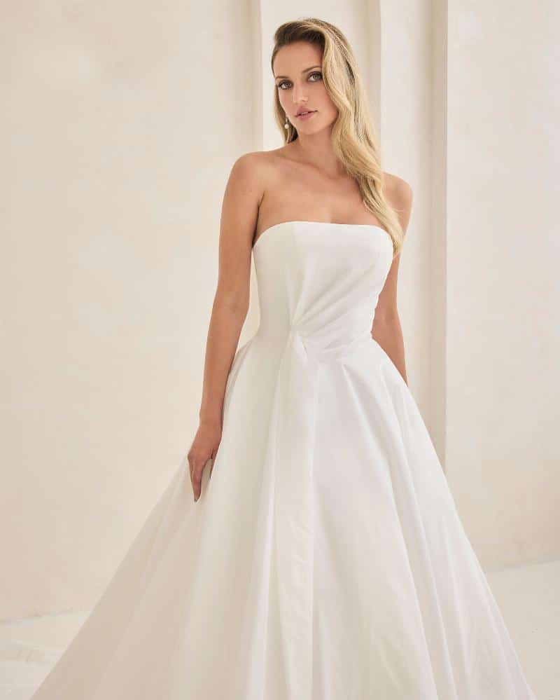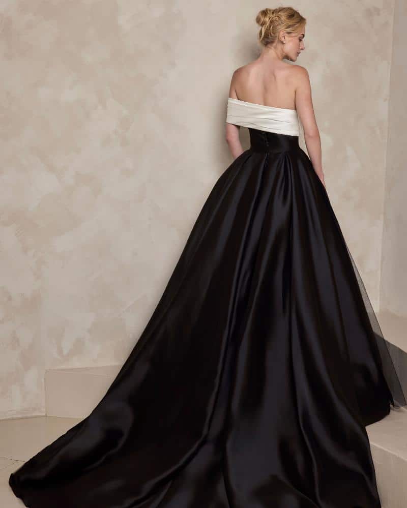 Sofia is a striking ivory and black wedding dress designed for the bride who wants to make a bold, romantic statement. Crafted from luxurious satin, this ball gown wedding dress features a detachable white off-the-shoulder piece that adds versatility and elegance to your look. Whether worn with or without her off-the-shoulder detail, Sofia’s modern yet timeless design exudes sophistication. Plus, for those seeking a more traditional option, she is available in ivory taffeta. With hidden pockets and a dramatic ball gown silhouette, Sofia ensures your bridal moment is nothing short of unforgettable.