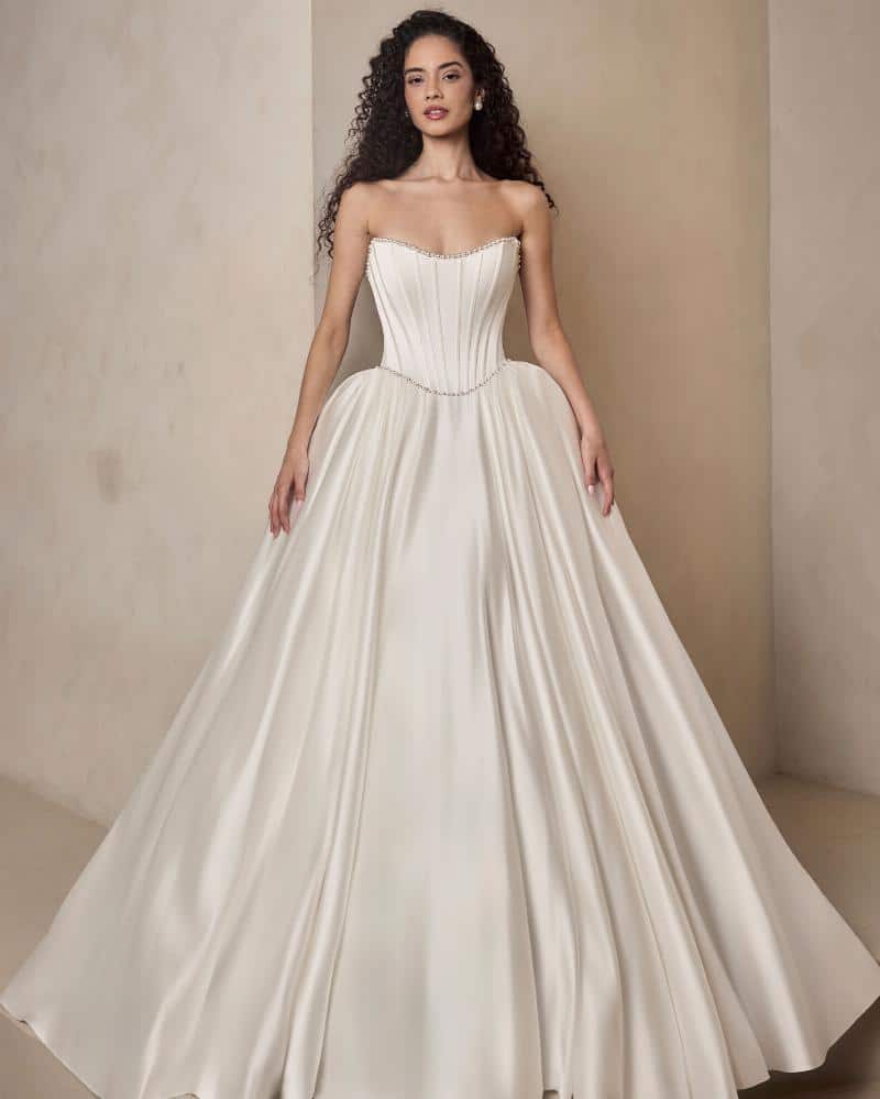 Vira is a vision of timeless elegance for the bride who craves a blend of modern simplicity and vintage charm. With her luxurious fabric and semi-sweetheart neckline, this satin ball gown wedding dress brings an air of regal sophistication. Her strapless bodice features delicate pearl embellishments, adding just the right amount of detail to make a stunning statement. With a long, flowing train and functional pockets,