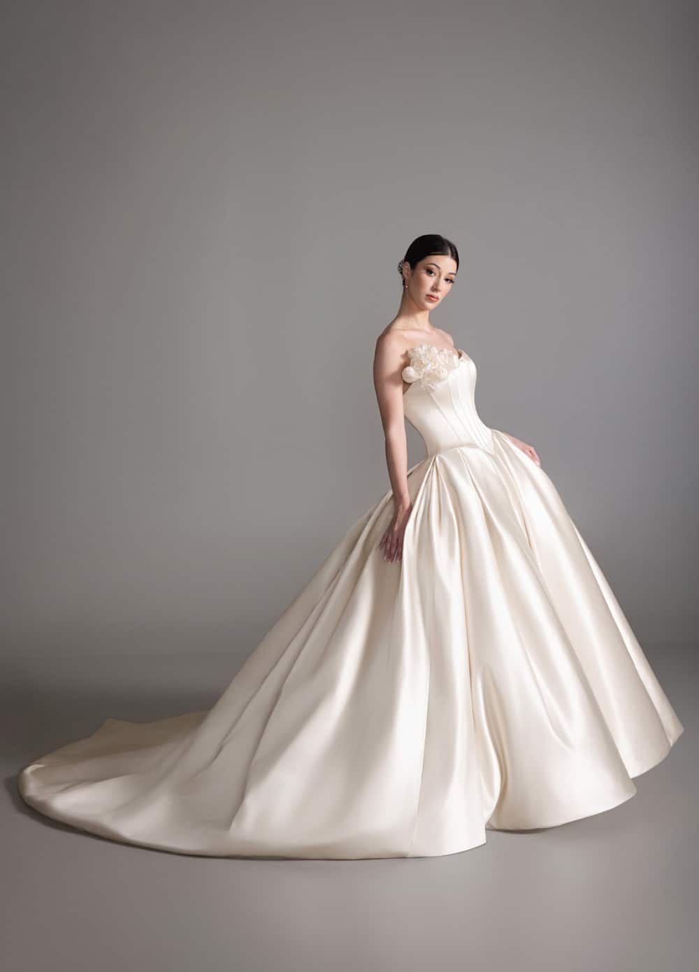 This strapless ballgown features a structured corseted bodice with clean vertical boning and a straight neckline, accented by soft floral appliqués and a dramatic black ribbon detail. The waist opens into a full satin skirt with sculpted pleats, creating bold volume and a sweeping train. The design pairs classic couture structure with a modern, graphic contrast.