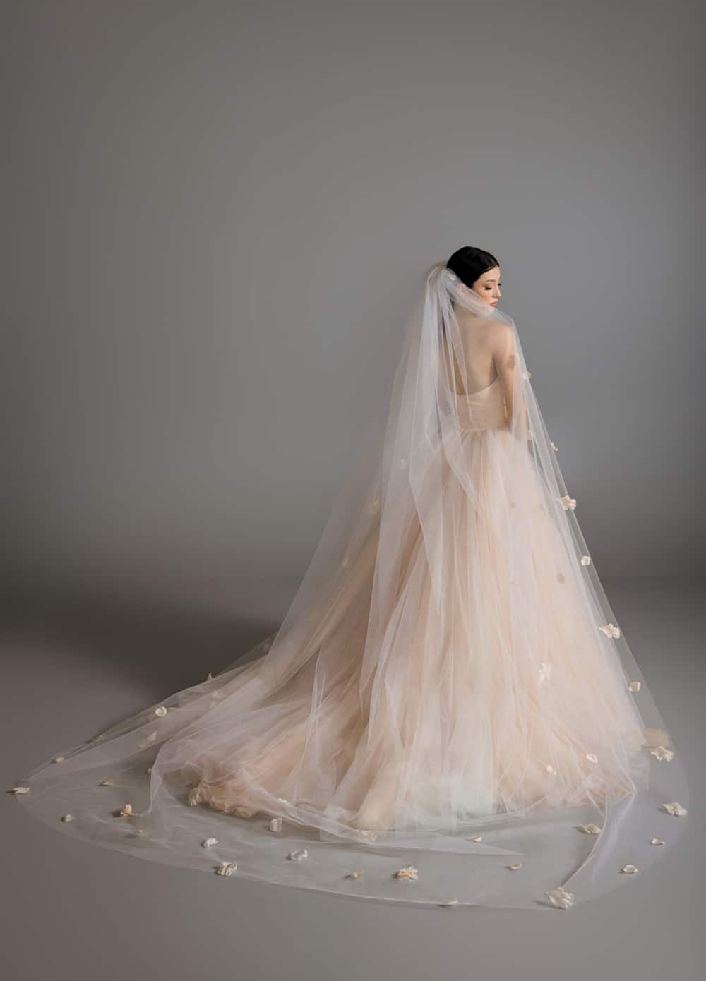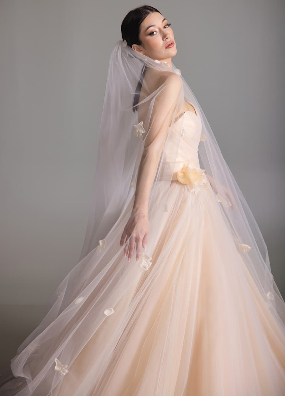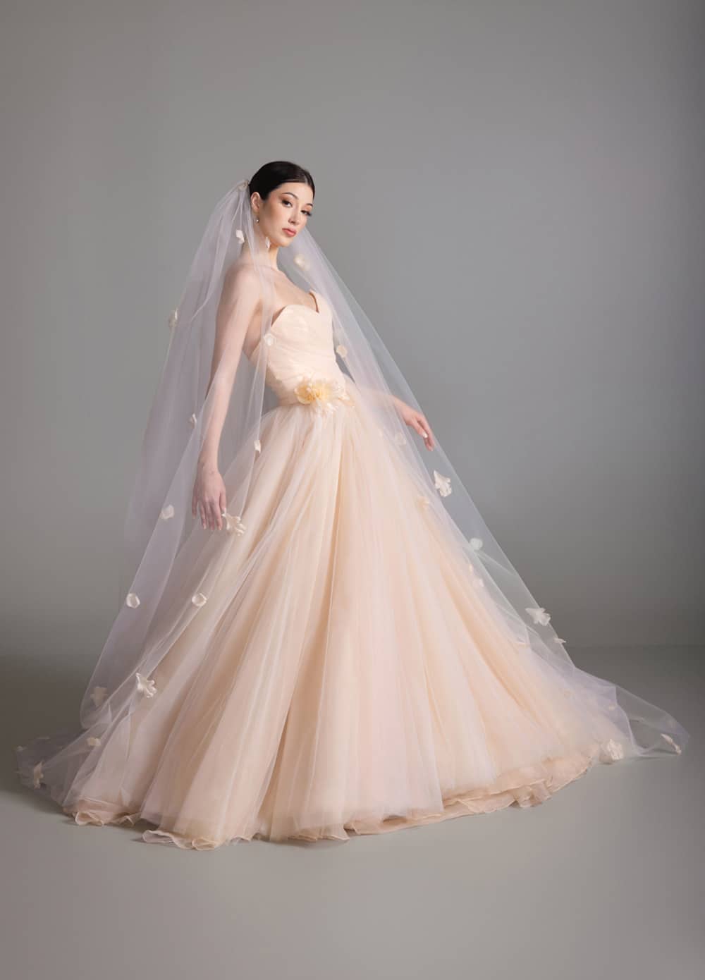 Romantic and ethereal, the Bloom gown from Blanc de Perez captures modern bridal femininity through soft color and fluid design. A delicately ruched sweetheart bodice melts into layers of airy blush tulle, creating a weightless, dreamlike silhouette. Floral appliqué accents at the waist add a subtle couture detail, while the voluminous skirt moves effortlessly with every step. Finished with a petal-adorned veil, this gown is designed for the bride drawn to romance, softness, and poetic elegance.