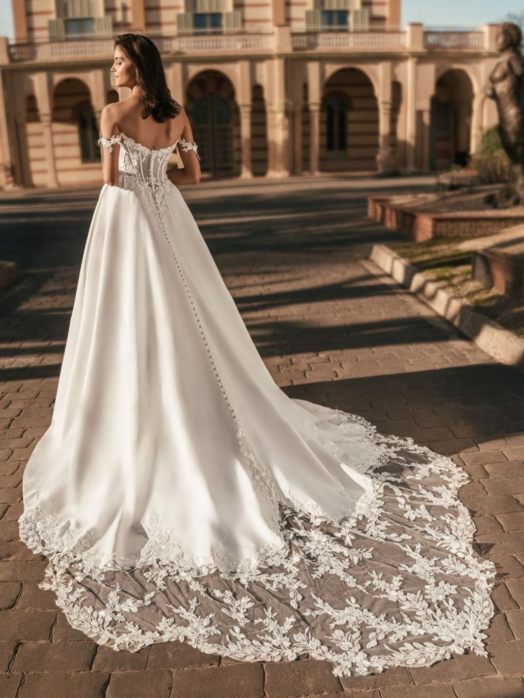 Udell by Blue by Enzoani is a timeless ball gown featuring a structured corset bodice with delicate sequinned floral embroidered lace accents. The clean, voluminous matte satin or Mikado skirt flows into a dramatic train, finished with a romantic lace-edged hem for an elegant and modern bridal look.
