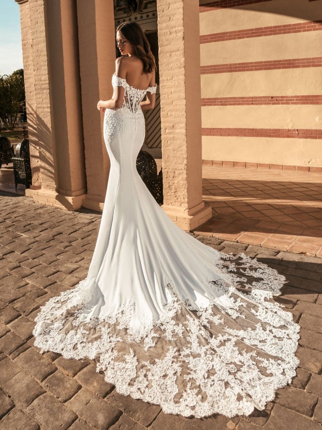 Umani by Blue by Enzoani is a sleek fit-and-flare gown crafted from smooth crepe satin, featuring a sculpted corset bodice with delicate corded floral lace accents and off-the-shoulder straps. The clean silhouette flows into a romantic lace-trimmed train, blending modern elegance with soft, feminine detail.