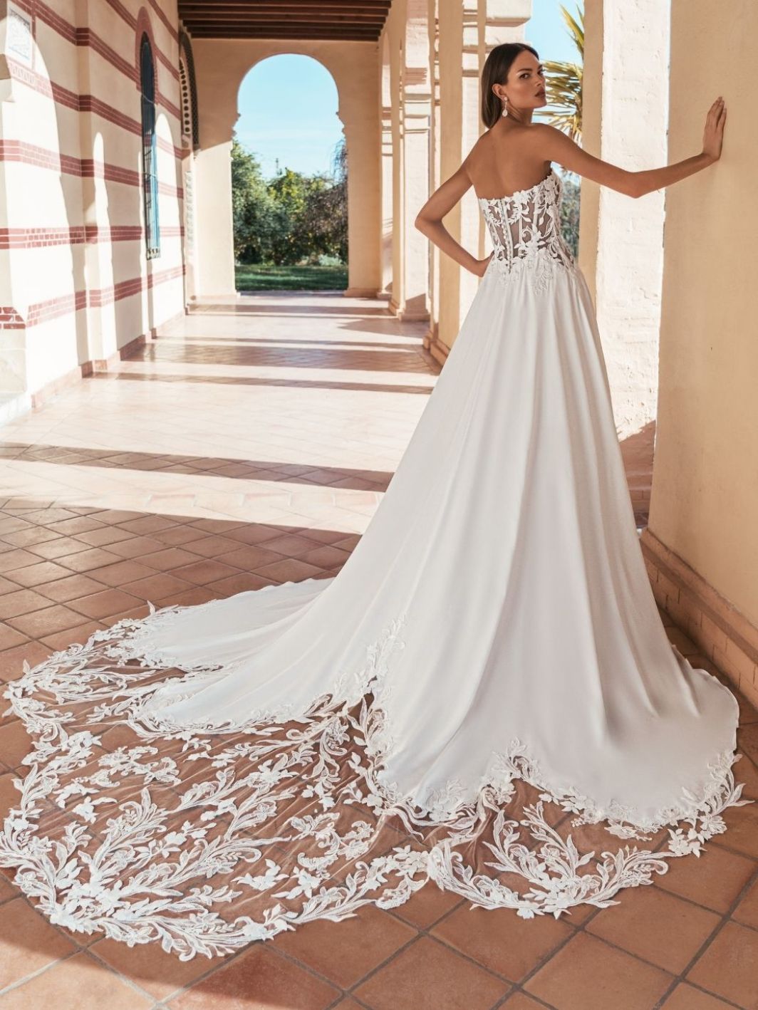 Ursina by Blue by Enzoani is an effortlessly elegant A-line gown crafted from soft crepe for a clean, flowing silhouette. The strapless corset bodice is adorned with delicate lace appliqués, while the skirt cascades into a romantic train finished with intricate lace detailing for a timeless bridal look.