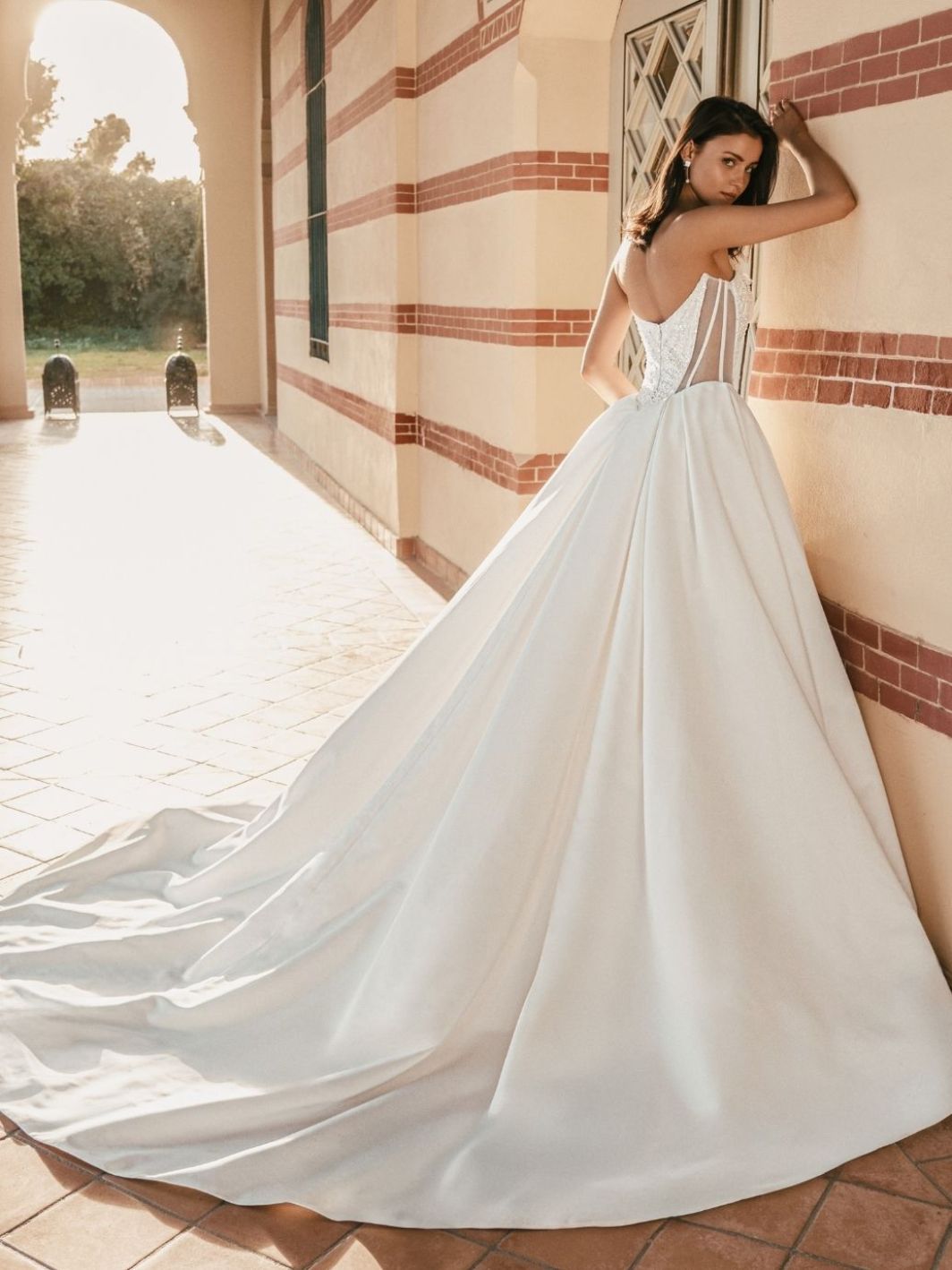 Usha by Blue by Enzoani is a modern ballgown that pairs a structured geometric beaded lace corset bodice with a voluminous matte satin or Mikado skirt. The sculpted silhouette is enhanced by subtle side cutouts and a dramatic train, creating a striking balance of contemporary detail and timeless elegance.