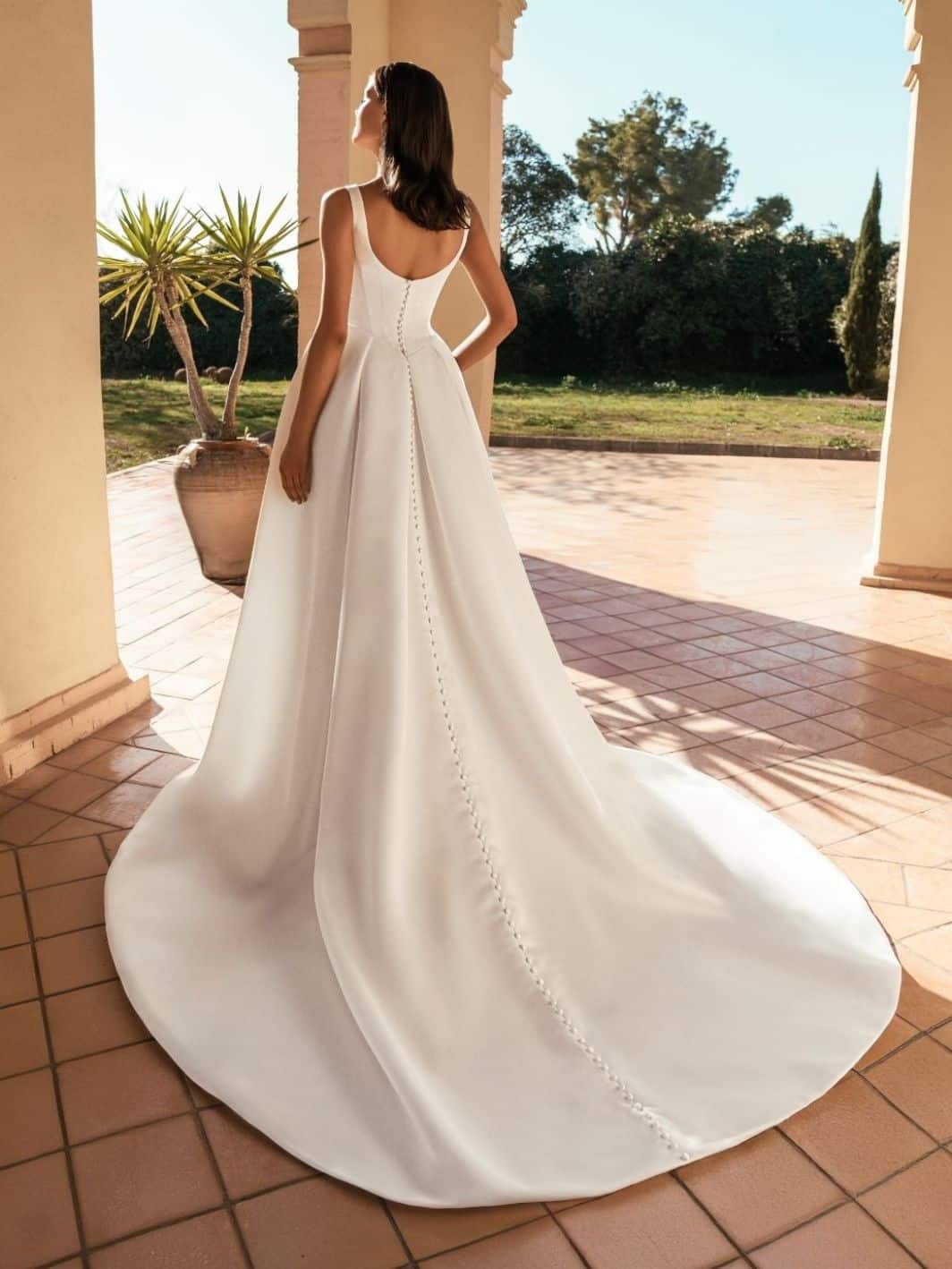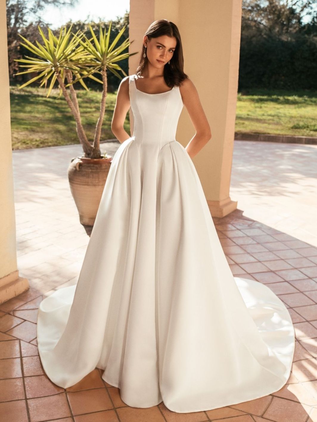 Uveline by Blue by Enzoani is a classic ballgown defined by its clean lines and regal silhouette. The structured square neckline bodice flows seamlessly into a full matte satin or Mikado skirt, complete with hidden pockets and a sweeping train finished with a row of delicate buttons for a timeless, polished finish.