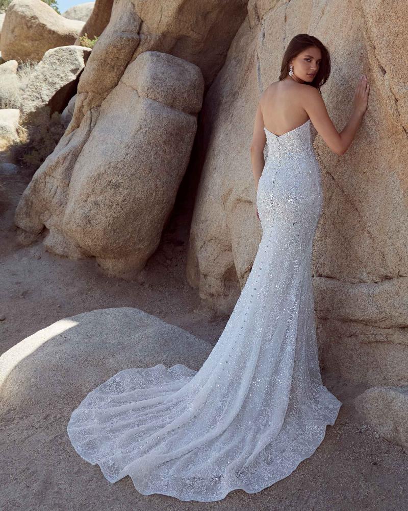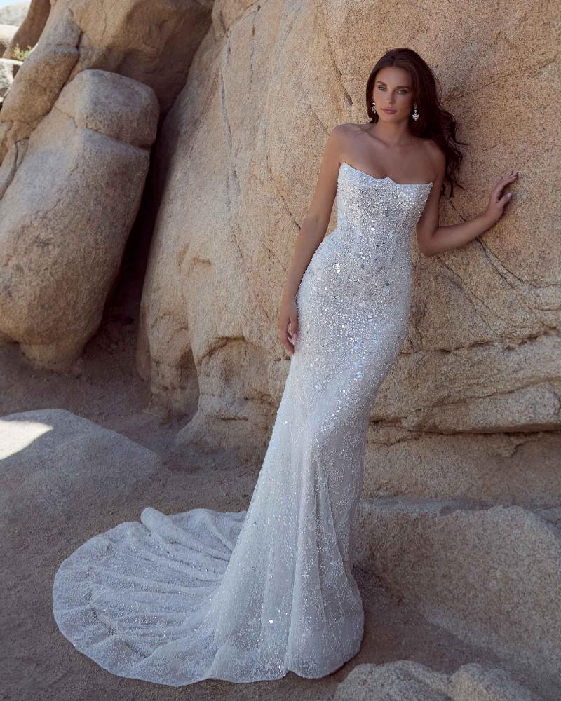With every shimmering detail, Branwen proves that a sparkly sheath wedding dress can be both glamorous and romantic. Her straight strapless neckline highlights the shoulders with refined elegance, while her beaded lace and sequins bring luminous texture to her sleek silhouette. Her structured bodice and fitted cut ensure a flattering shape, while her glittering train and matching veil complete a look that feels effortlessly modern and utterly sophisticated.