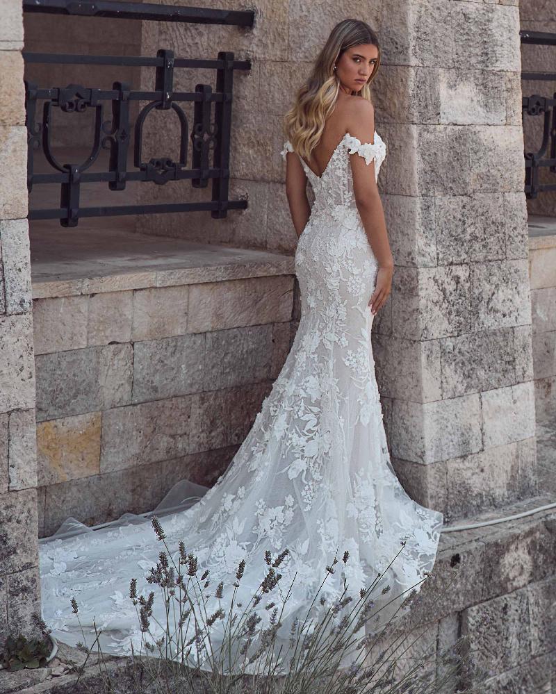 Eleni is an ethereal off-the-shoulder sheath wedding dress that perfectly blends romance and statement-making glamor. With delicate 3D lace details cascading down the gown, her fitted silhouette highlights your curves, while her long, dramatic train adds an undeniable sense of elegance. Her off-the-shoulder neckline complements the intricate sweetheart design, creating a soft, feminine look that’s perfect for a destination wedding or a romantic ceremony. Whether you're walking down a sandy aisle or dancing under the stars, Eleni is a showstopper that will have all eyes on you.