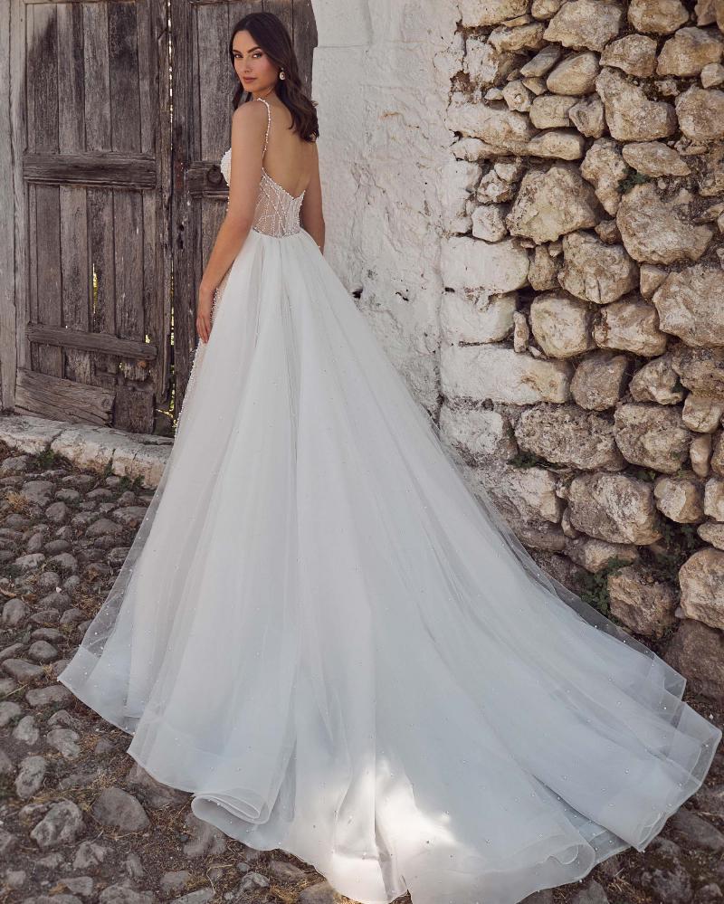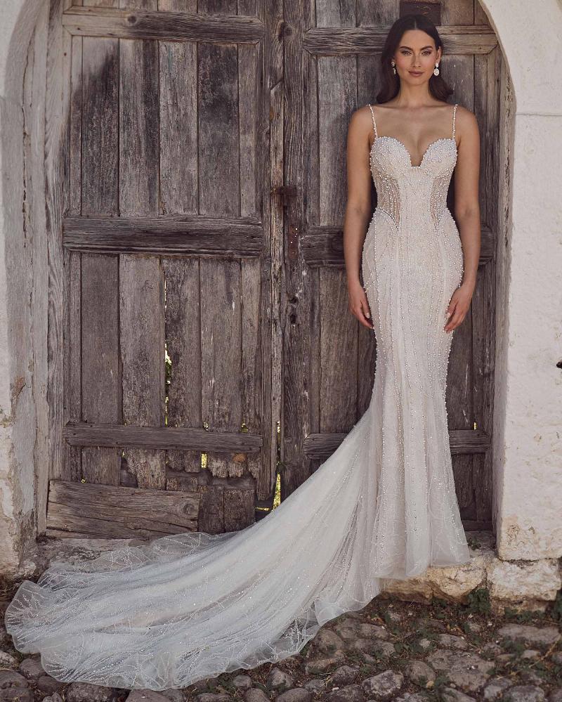 Gisela is the embodiment of sexy wedding dress sophistication. This show-stopping gown dazzles with her intricate pearl beading and sultry silhouette, perfect for the bride looking to make an unforgettable statement. Her sweetheart neckline and delicate spaghetti straps highlight the décolletage, while sparkling details throughout the dress capture the light in every photo. For even more drama, her detachable overskirt adds a touch of grandeur, transitioning seamlessly from a sleek sheath gown to a romantic look that commands attention. Whether paired with the overskirt or worn on its own, Gisela’s combination of vintage glamor and modern allure makes her the perfect choice for a luxurious celebration.