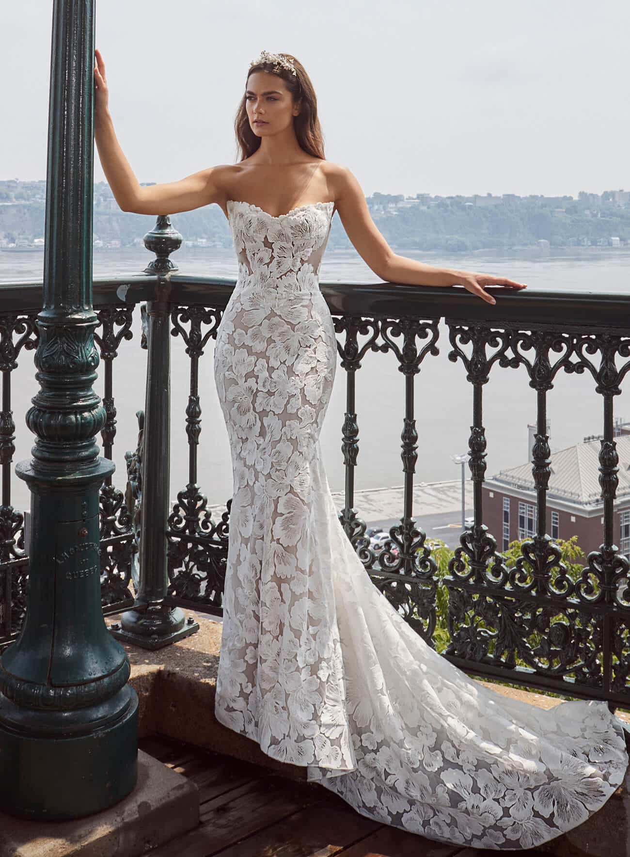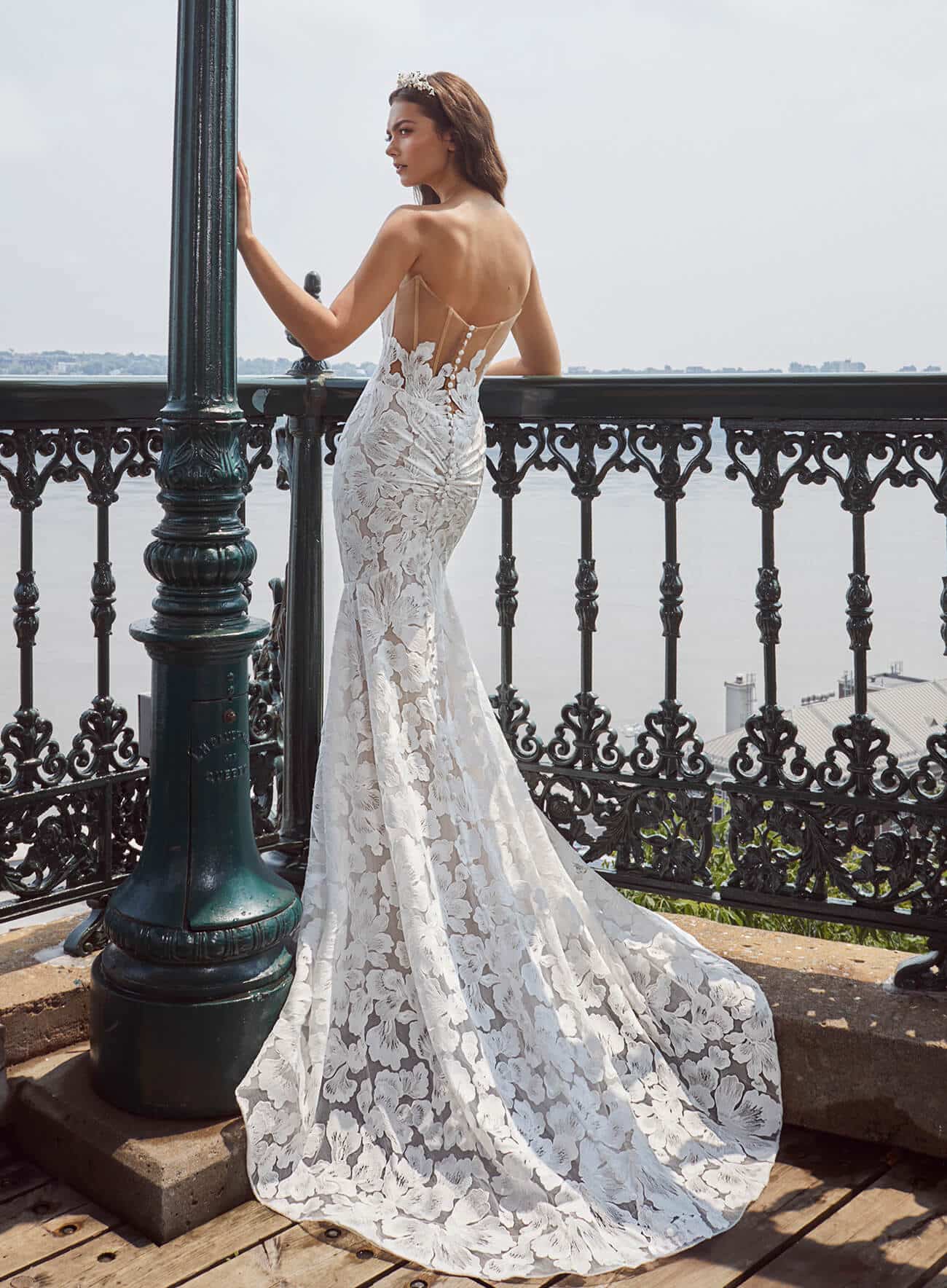 Sweet, stunning and simply a showstopper we’re ready for brides to blossom with bridal elegance in our charming Jill. Adorned with bold floral lace that dances across a fitted sheath silhouette this strapless wedding gown is sure to impress everyone in the audience. Her semi-sweetheart neckline radiates grace, and the button details found along her backless illusion add a dash of classically romantic charm. Jill will have brides who seek timeless beauty and sophistication falling in love the moment they meet her.