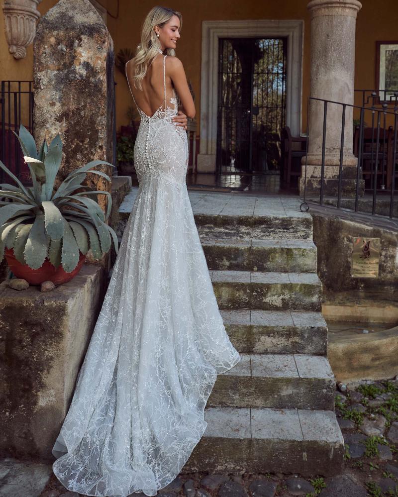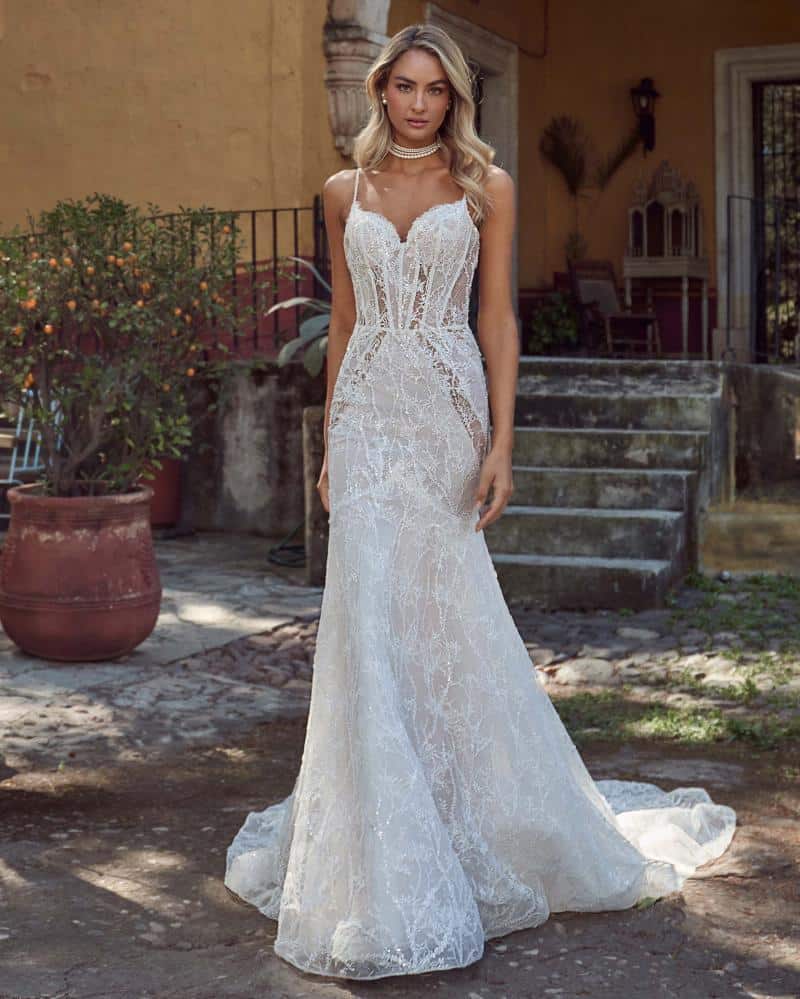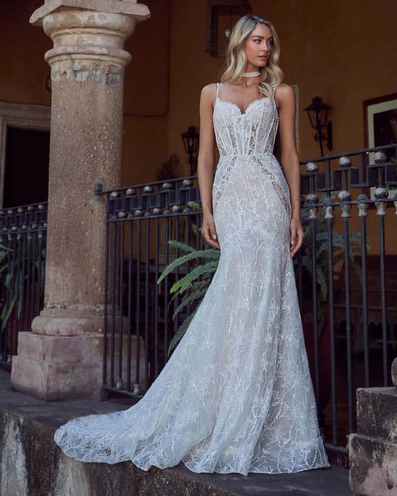 Khelani is a stunning sexy mermaid wedding dress designed to captivate even the harshest wedding dress critics. This exquisite gown features a delicate lace overlay adorned with shimmering sequins that catch the light with every I Do. Her bodice, structured with intricate boning, showcases a sweetheart neckline and dainty spaghetti straps, creating a next level silhouette. Her dramatic open back, paired with her fitted silhouette with expertly placed illusions, accentuates your curves and adds a touch of modern sophistication. Perfect for brides seeking a blend of elegance and sensuality, Khelani ensures you will dazzle.