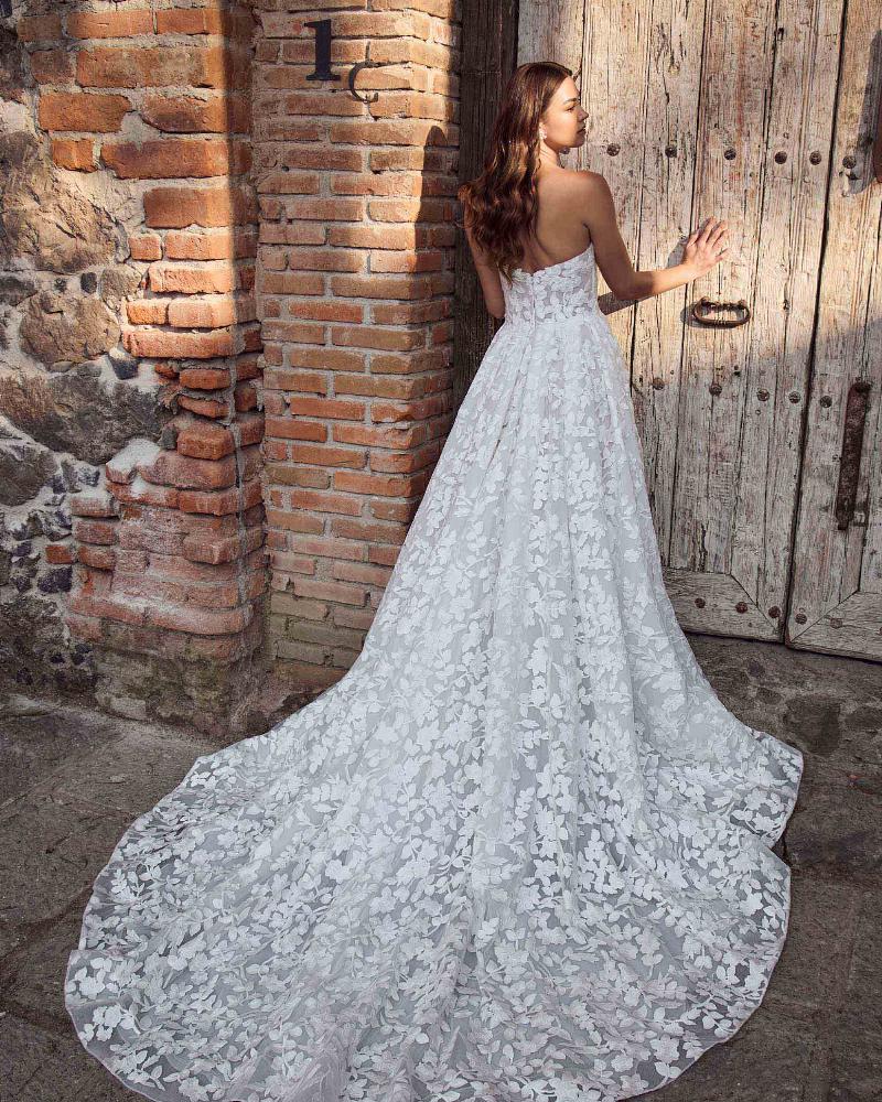 An A line wedding dress with soft structure and romantic detail, Kymberlyn balances timelessness with a touch of modern ease. Her strapless sweetheart neckline flatters the collarbone while leafy lace appliqués cascade across the bodice and float down her full skirt. A hidden slit adds subtle drama and freedom of movement, perfect for twirling or a beachside breeze. With practical pockets, a sweeping train and matching veil (V2554F), she’s a classic beauty made for graceful entrances and unforgettable exits.