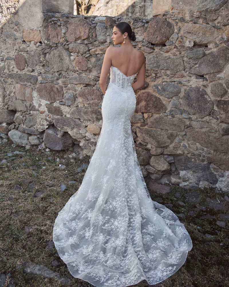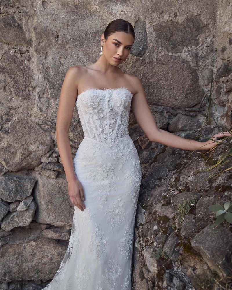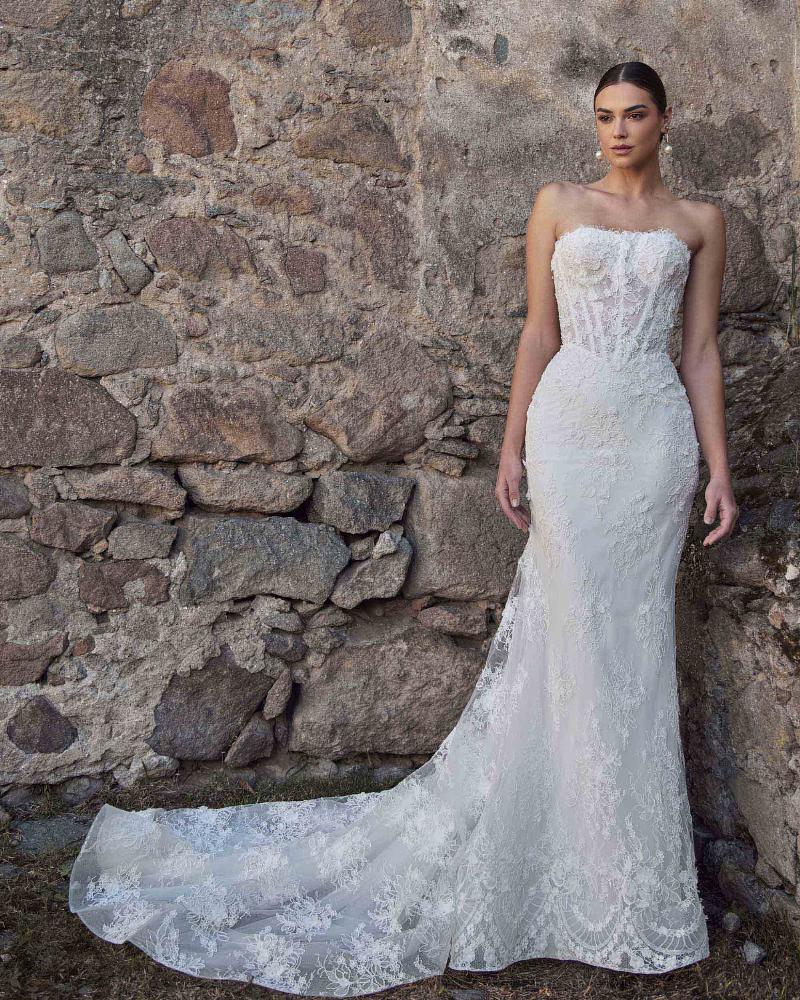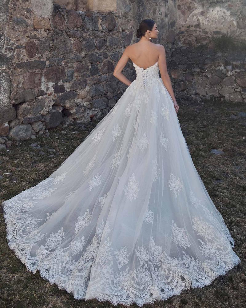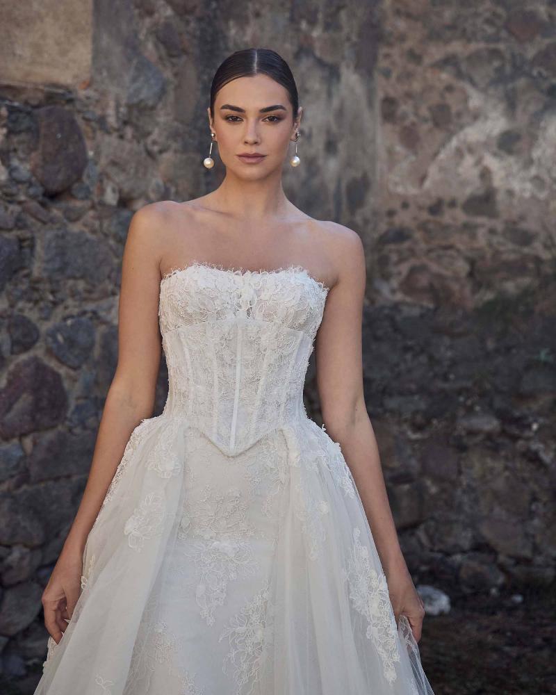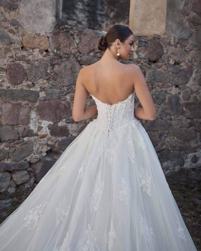 Odara is a vintage lace wedding dress designed with transformation in mind. Her sculpted strapless bodice with visible boning features a semi-sweetheart neckline adorned in delicate 3D lace. First, she’s a romantic sheath silhouette, then seamlessly shifts into a voluminous ball gown with her fully detachable lace corset overskirt. This versatile design lets you move from an intimate ceremony to a grand celebration without ever changing out of the dress you love.