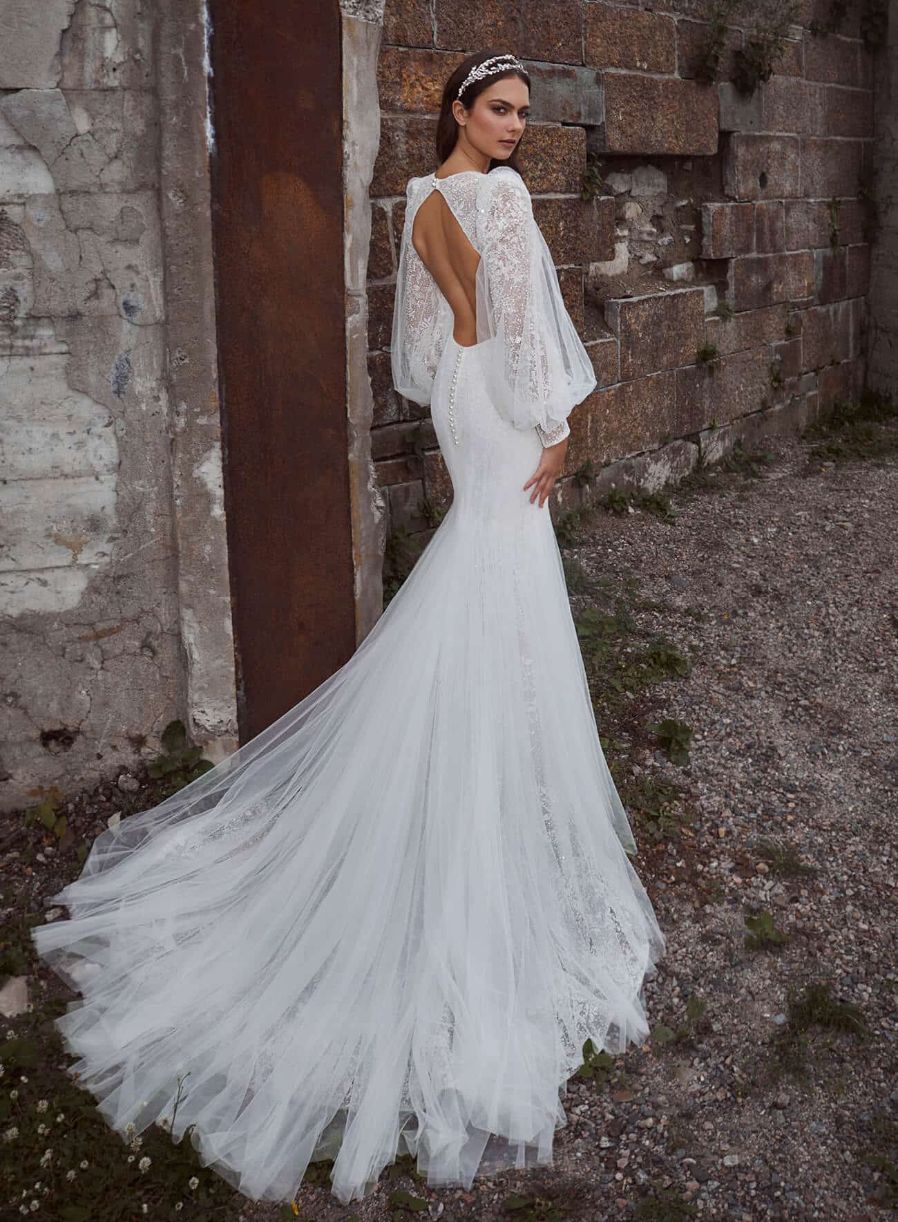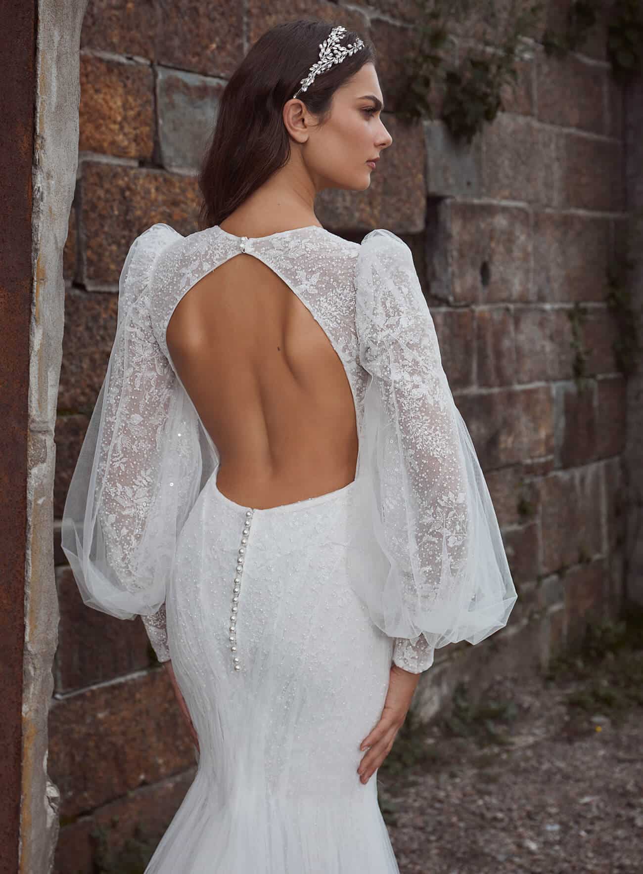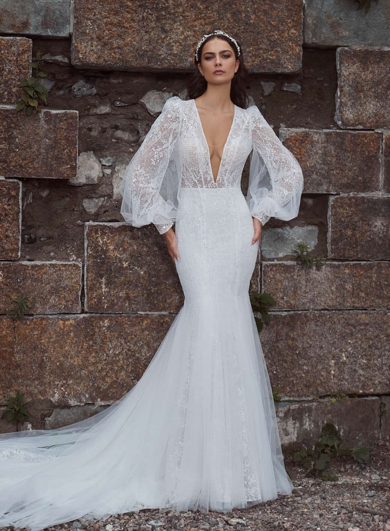 Just wait until you get to uncover all of Randa’s timeless elegance when you meet her in person. Her beaded lace bodice continues into a tulle skirt creating a striking mermaid silhouette. Designed with a head turning V-plunge neckline that, with a simple turn, leads to an equally head turning open keyhole back while her long balloon sleeves add a touch of modesty. Look closely to find pearl button details that provide the finishing touch.
