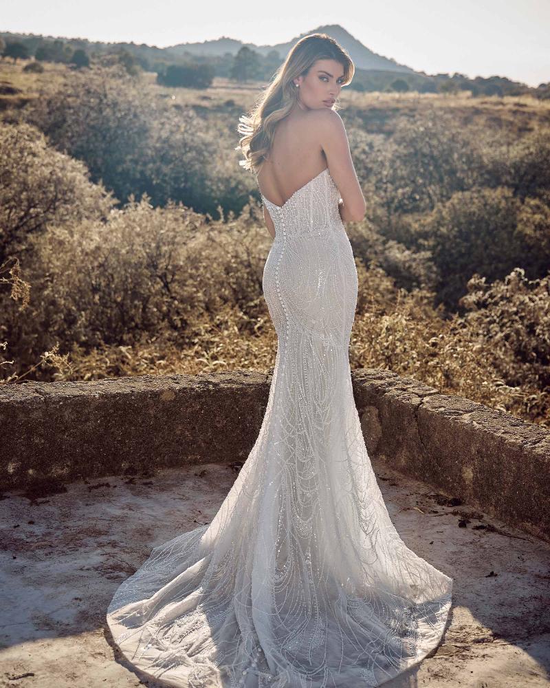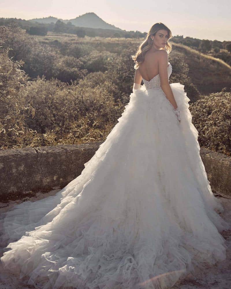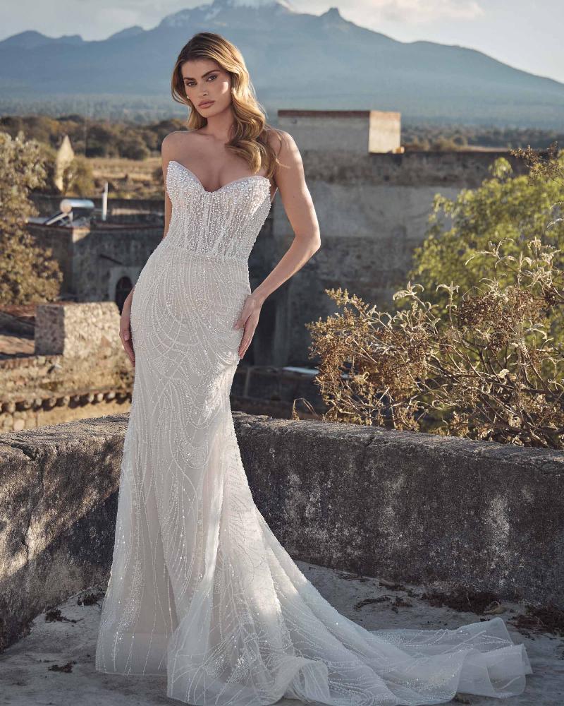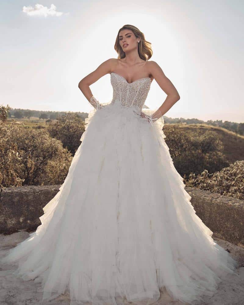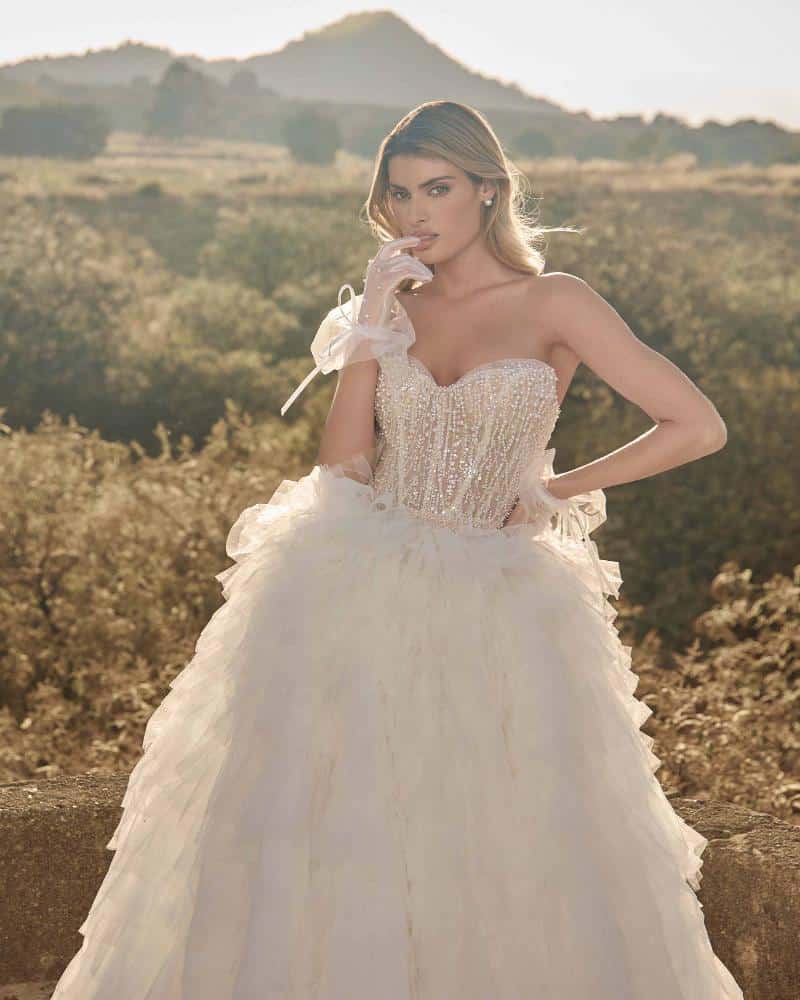 A strapless sparkly wedding dress like Rivienne knows how to steal the spotlight. From the sculpted semi-sweetheart neckline to the curve-hugging sheath silhouette, every inch is designed to dazzle with beaded lace and luminous detailing. For those craving drama, her voluminous detachable tulle overskirt delivers a showstopping moment—soft, romantic, and impossibly grand. Additionally, her matching gloves complete the look with couture-level flair, making this gown a glamorous fantasy from ceremony to reception.