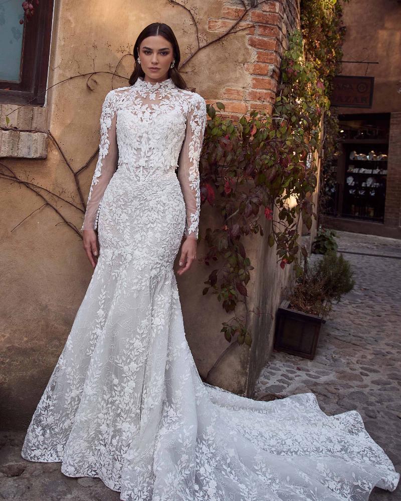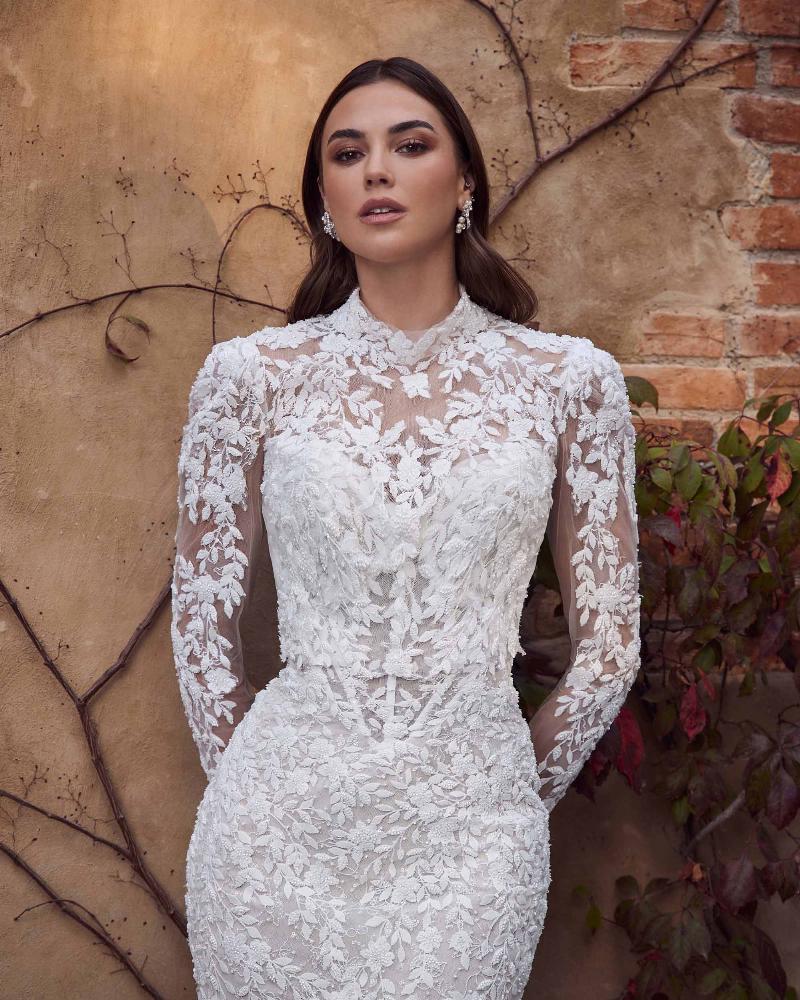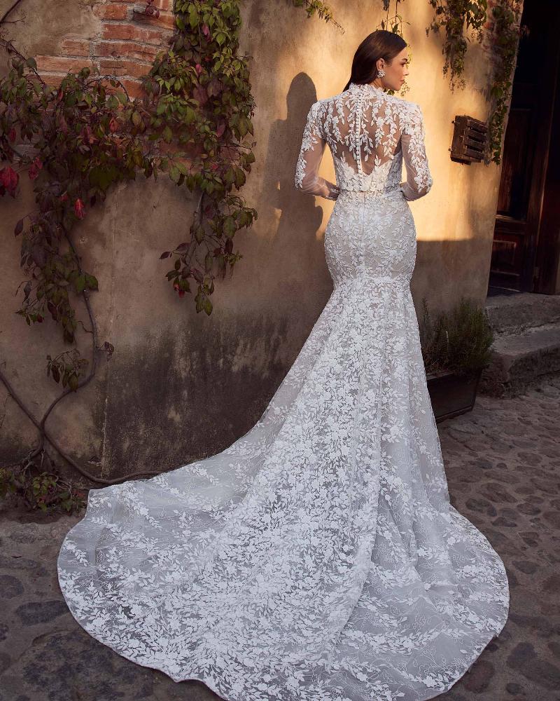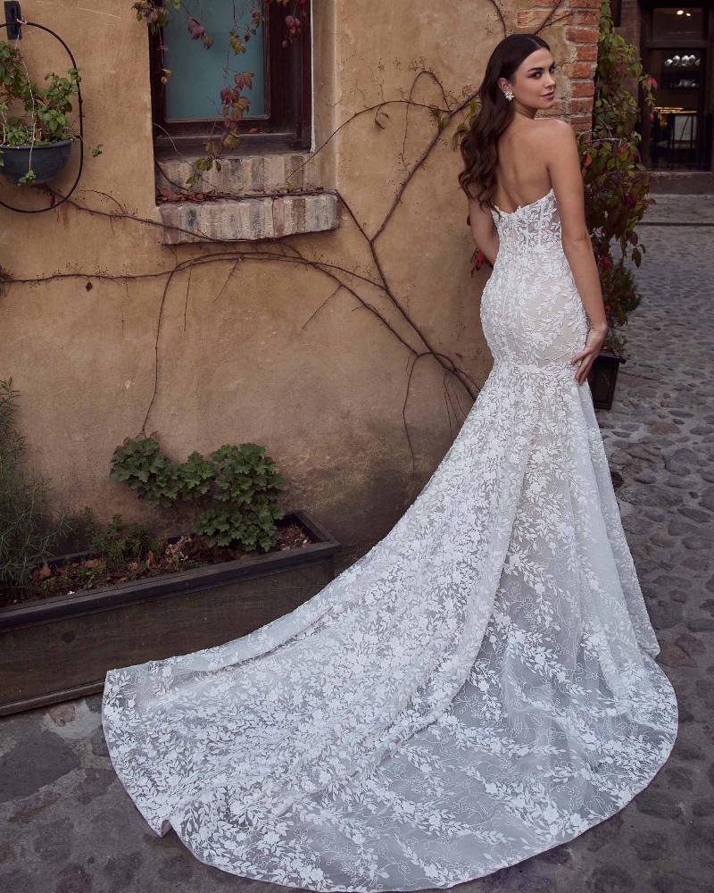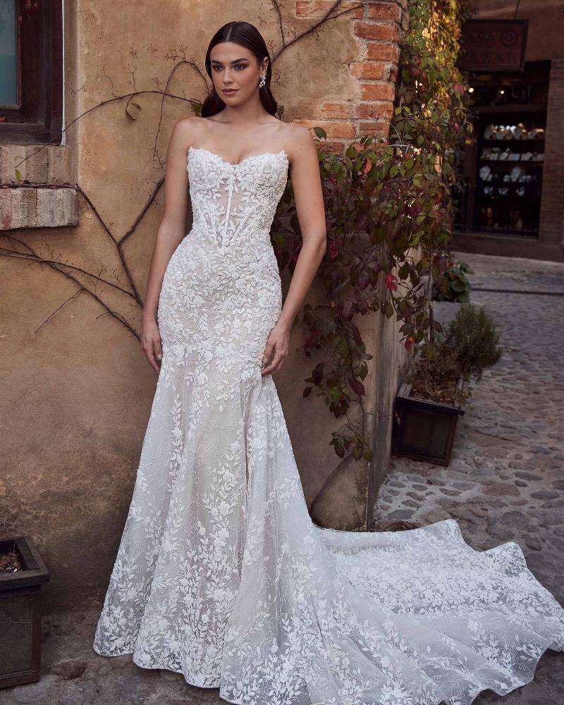 This glamorous mermaid wedding dress brings two equally stunning looks in one unforgettable design. Tavira’s strapless sweetheart neckline draws the eye to her corset-inspired bodice, delicately adorned with beaded lace for soft sparkle and structure. Her fitted silhouette flows into a graceful train, while a matching high-neck lace jacket and matching veil (V2551K) transform the look with modest elegance. Whether you're dreaming of destination romance or a showstopping entrance in your home town, she's made to turn heads from aisle to afterparty.