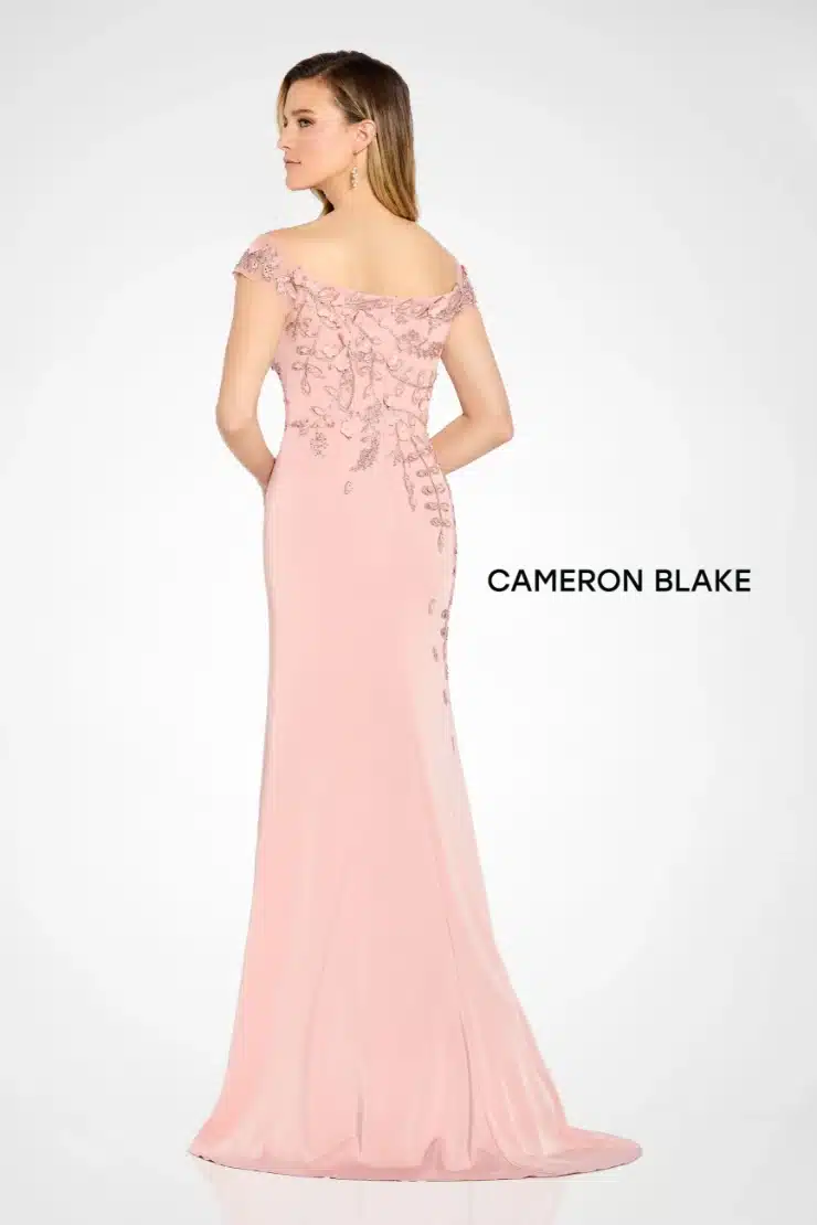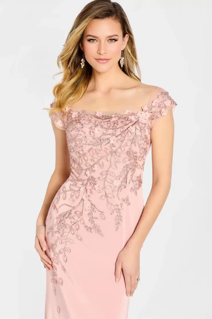 Elegant sheath gown in stretch crepe featuring a tip-of-the-shoulder neckline and cap sleeves. Includes detachable tulle straps and a shawl.