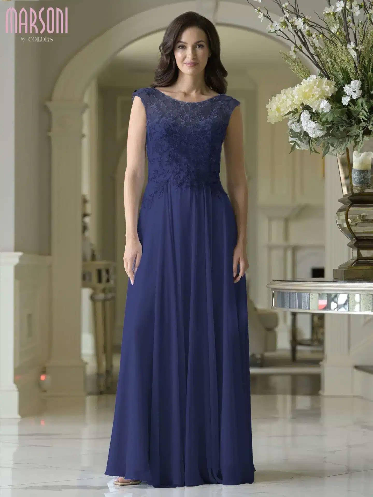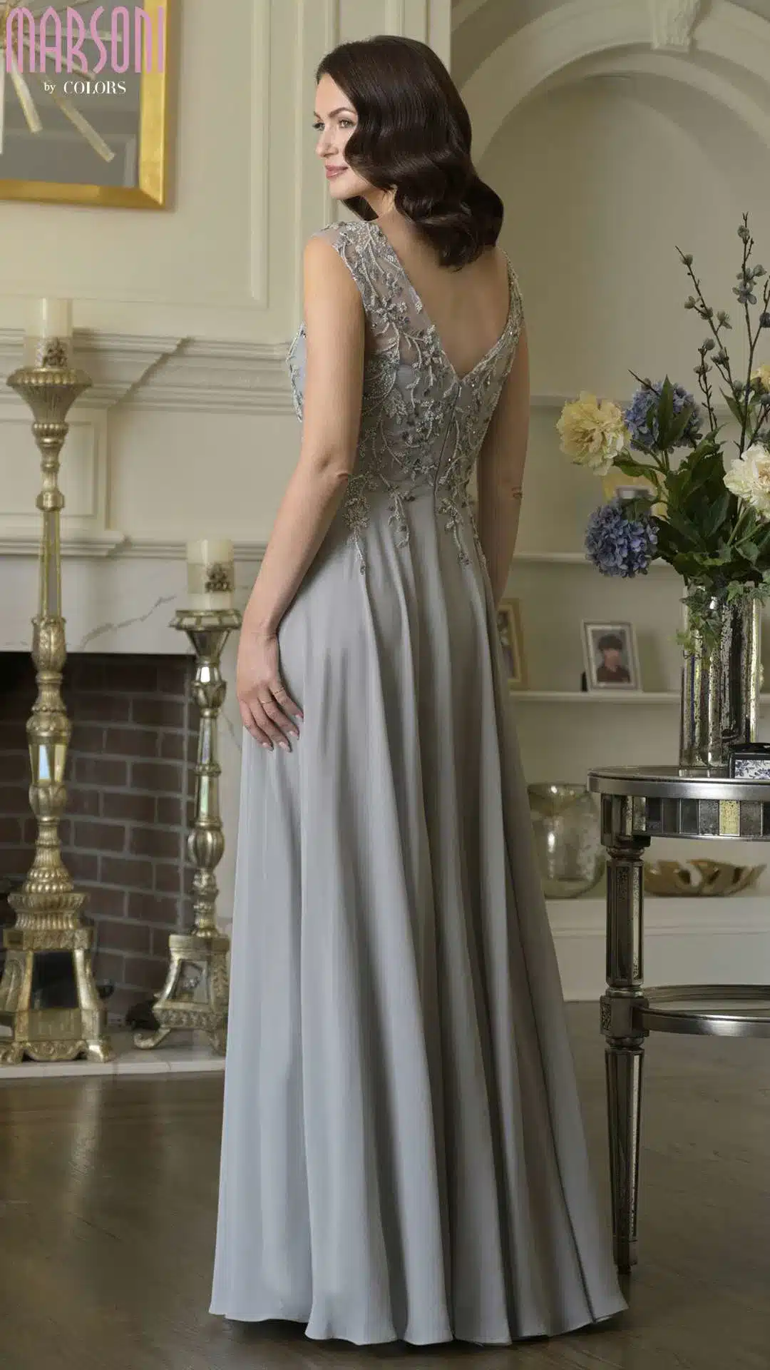 A chiffon A-line gown that features an illusion neckline with an embroidered and beaded bodice flowing into a graceful floor-length skirt, finished with a zipper closure for timeless elegance.