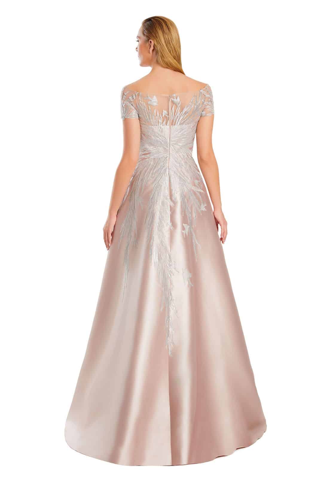 Shiny satin, features an A-line silhouette with an illusion off-the-shoulder neckline and short sleeves. The feather and bird design add charm to this gorgeous formal dress. It is finished with a sultry off-center slit, a mid-rise back, and a sweep train.