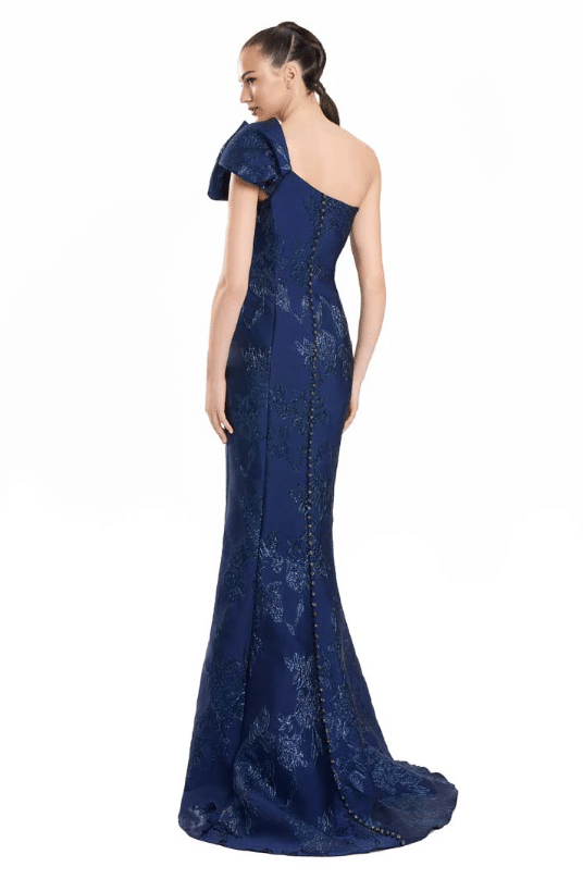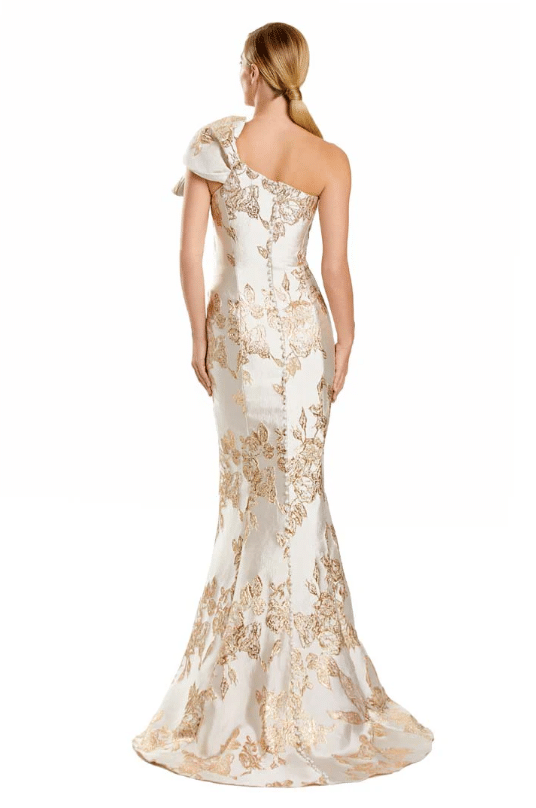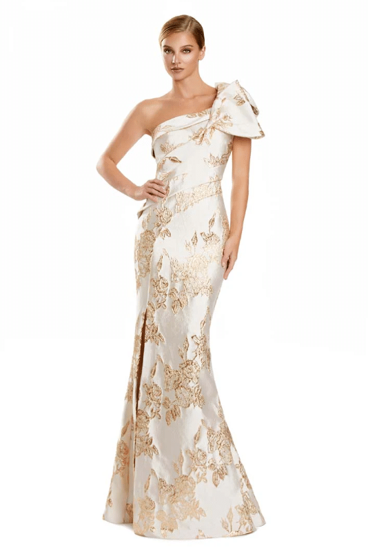 Regal and refined, this one-shoulder gown is a stunning statement piece for the mother of the bride or groom. The dress is beautifully crafted in a rich jacquard fabric, featuring metallic floral detailing that shimmers with sophistication. The dramatic bow accent at the shoulder adds a touch of couture flair, while the asymmetrical neckline frames the collarbone with elegance. A fitted bodice and contoured seaming highlight the waist before flowing into a flared hem with a subtle train, ensuring graceful movement with every step. Available in a selection of striking colorways, this gown exudes timeless glamour with a modern twist.