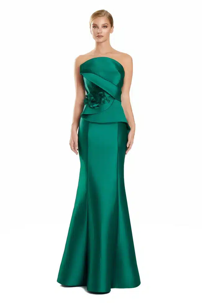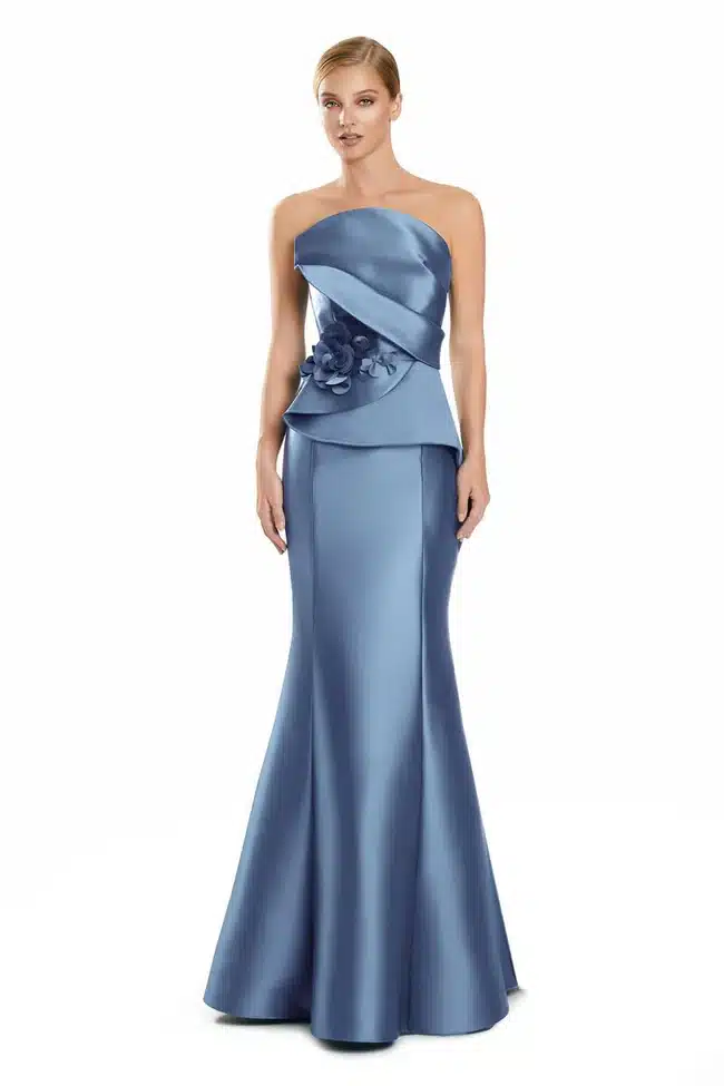 Chic and sculptural, this strapless gown is designed in a luxe satin fabric that drapes beautifully over the body. The asymmetrical neckline and layered peplum detail create a modern, flattering silhouette, accented by delicate 3D floral appliqué at the waist. The fitted skirt flows into a soft flared hem, while a row of covered buttons down the back adds a timeless finishing touch. A coordinating shawl completes the look, offering versatile elegance for any formal occasion.