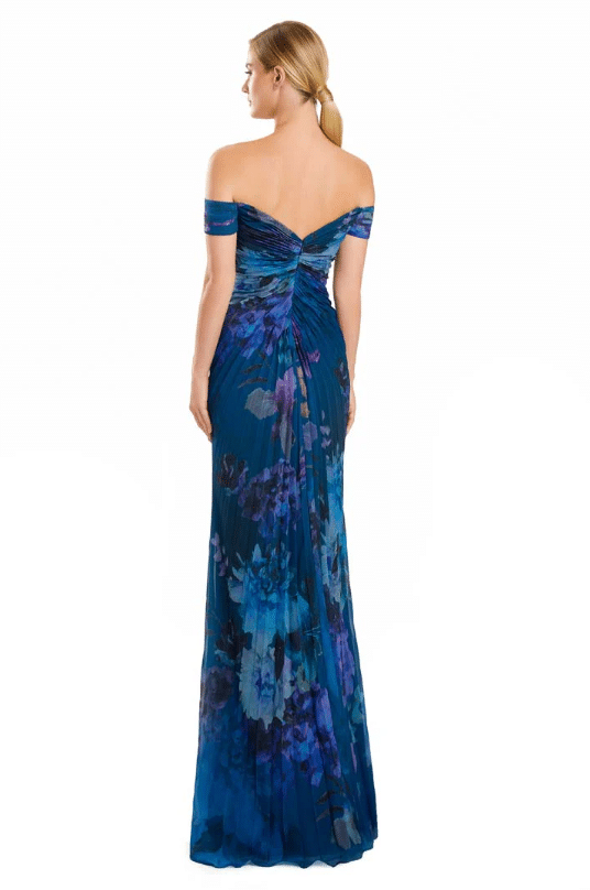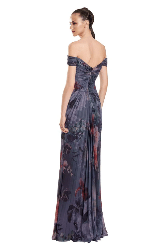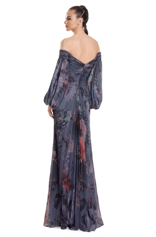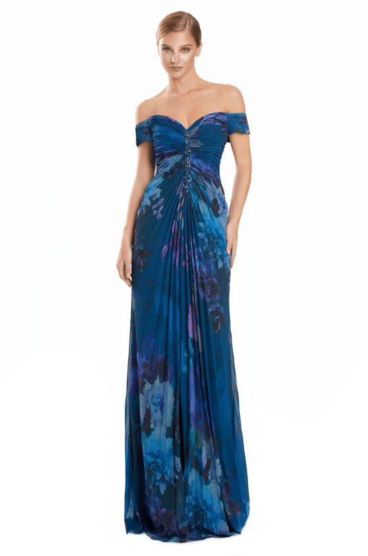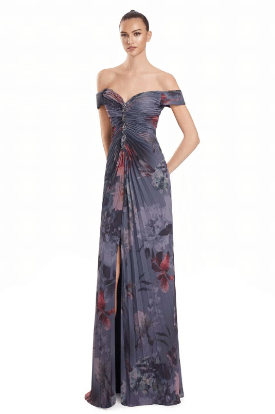 A romantic and ethereal choice, this off-the-shoulder gown is designed in flowing chiffon with a dreamy watercolor floral print. The sweetheart neckline is accentuated with delicate ruching and jeweled button detailing down the bodice, creating a slimming effect. Billowing sheer poet sleeves add soft movement and versatility, easily worn on or off the shoulder. The pleated skirt falls gracefully to the floor with fluid ease, finished with a subtle slit option for added allure. Available in a range of striking floral tones, this gown is the perfect balance of elegance and modern femininity for the Mother of the Bride or Groom.