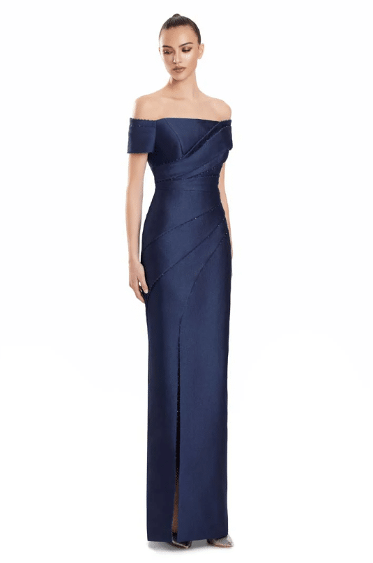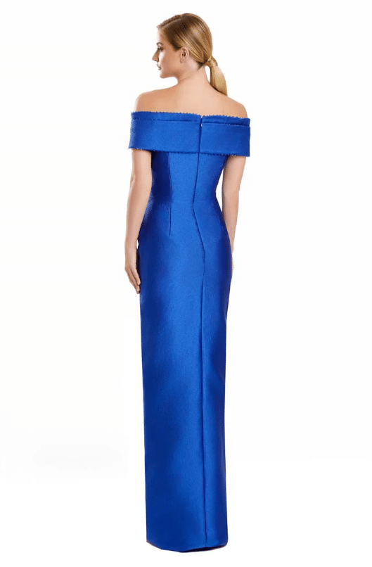 Sleek, modern, and effortlessly elegant, this Alexander by Daymor gown is the epitome of refined eveningwear. Designed in a luxurious fabric with a subtle sheen, the dress features an off-the-shoulder neckline that beautifully frames the shoulders and collarbone. The bodice and skirt are detailed with asymmetrical pleated bands that wrap across the body, creating a flattering sculpted effect and elongating silhouette. A fitted column skirt with a front slit adds a touch of movement and allure, while the back maintains a clean, structured finish. Perfect for the mother of the bride or groom, this gown combines timeless sophistication with contemporary artistry for a memorable look.