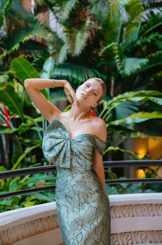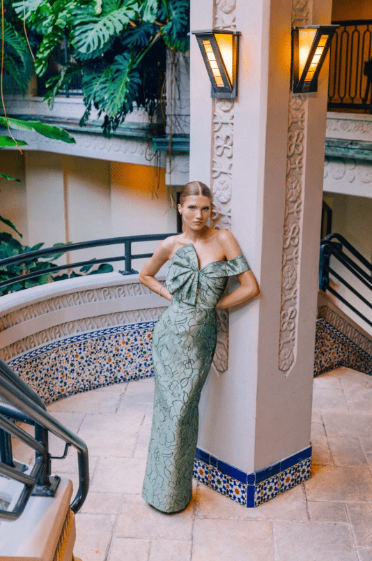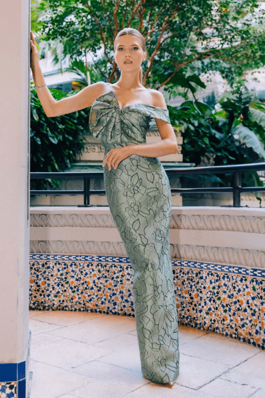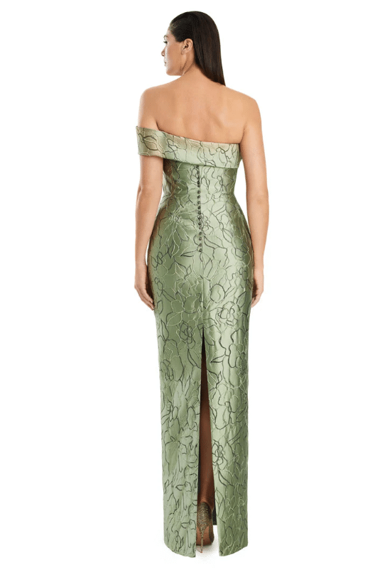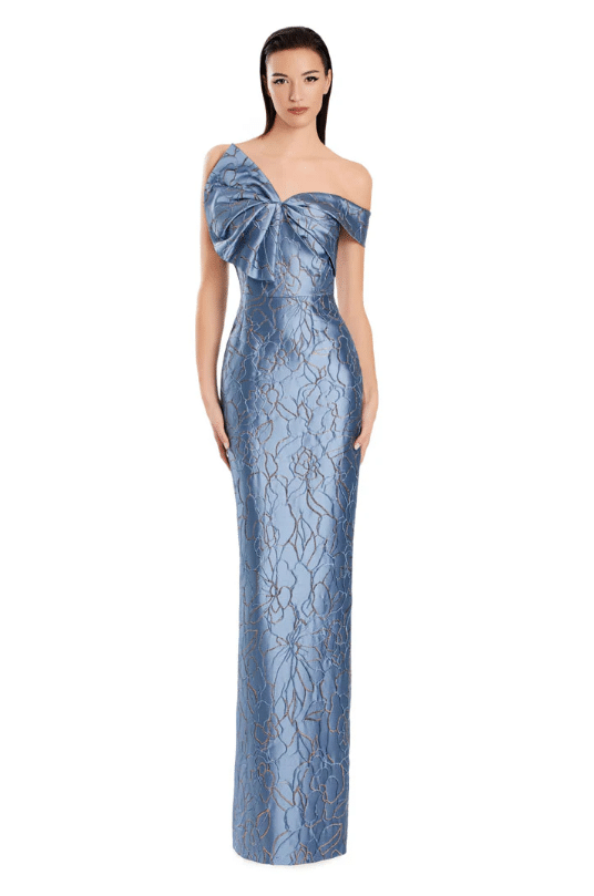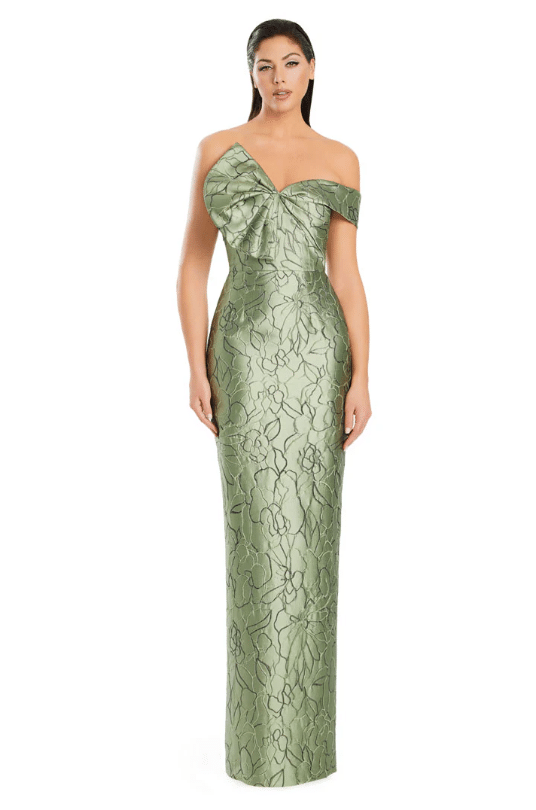 Sleek sophistication meets couture detail in this Alexander by Daymor gown. Crafted in a rich jacquard fabric with a subtle floral motif, this off-the-shoulder design makes an elegant statement. The bodice features an asymmetrical bow detail that draws the eye and adds sculptural dimension, while the fitted column silhouette creates a flattering, elongated shape. Covered buttons trail down the back to a center slit, balancing modern refinement with timeless elegance. Available in an array of striking hues, this gown is a perfect choice for the mother of the bride or groom who desires a polished and memorable look.