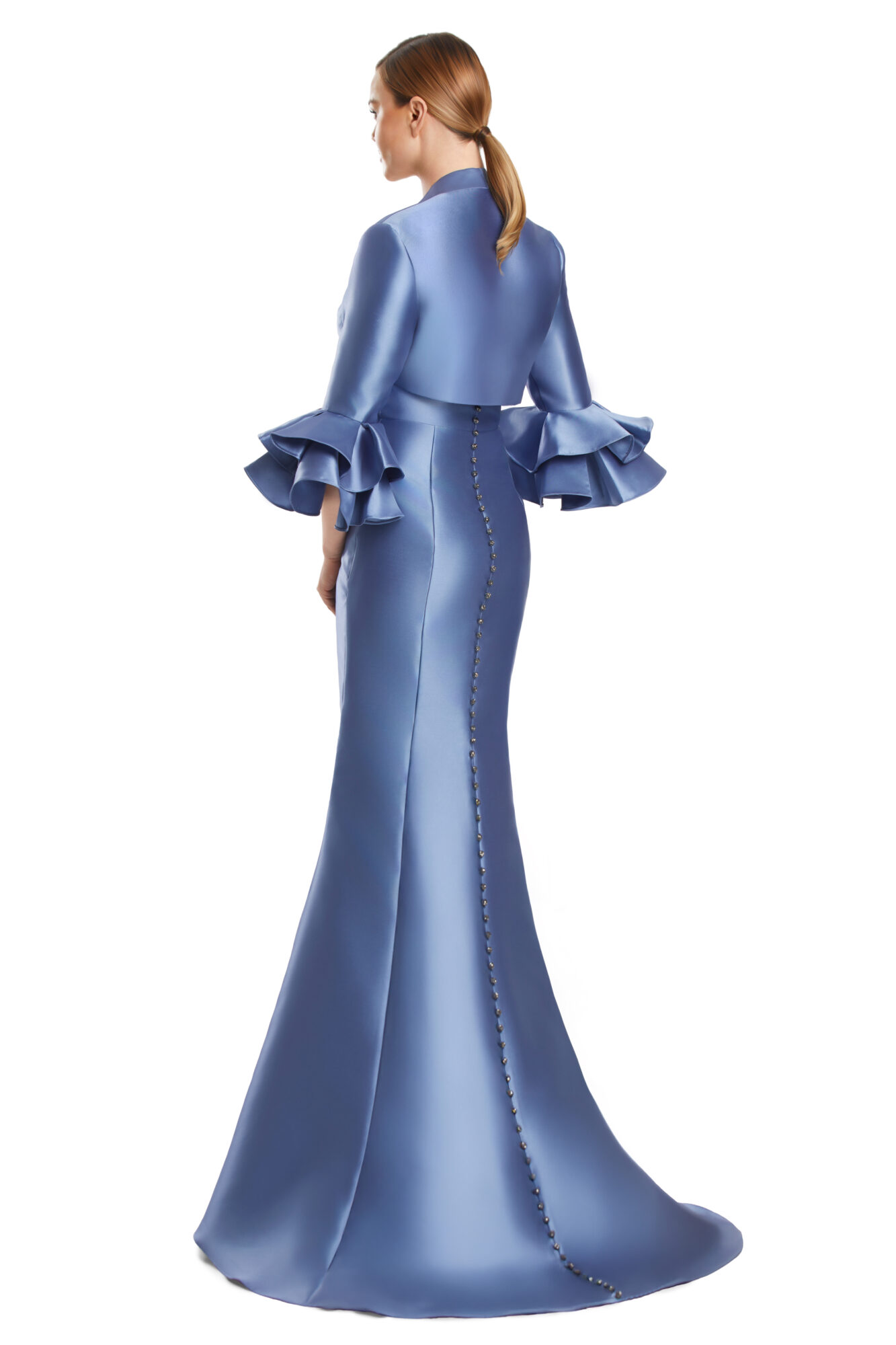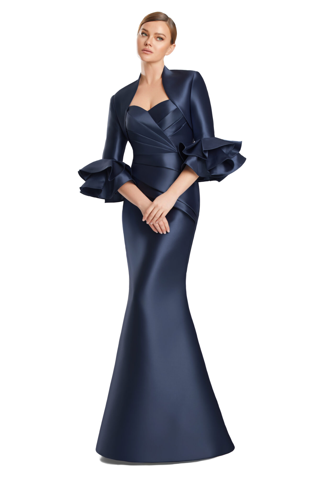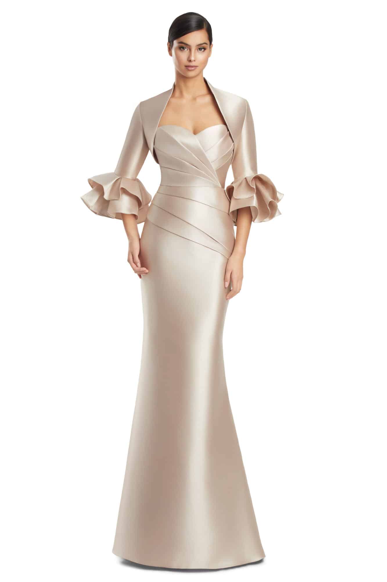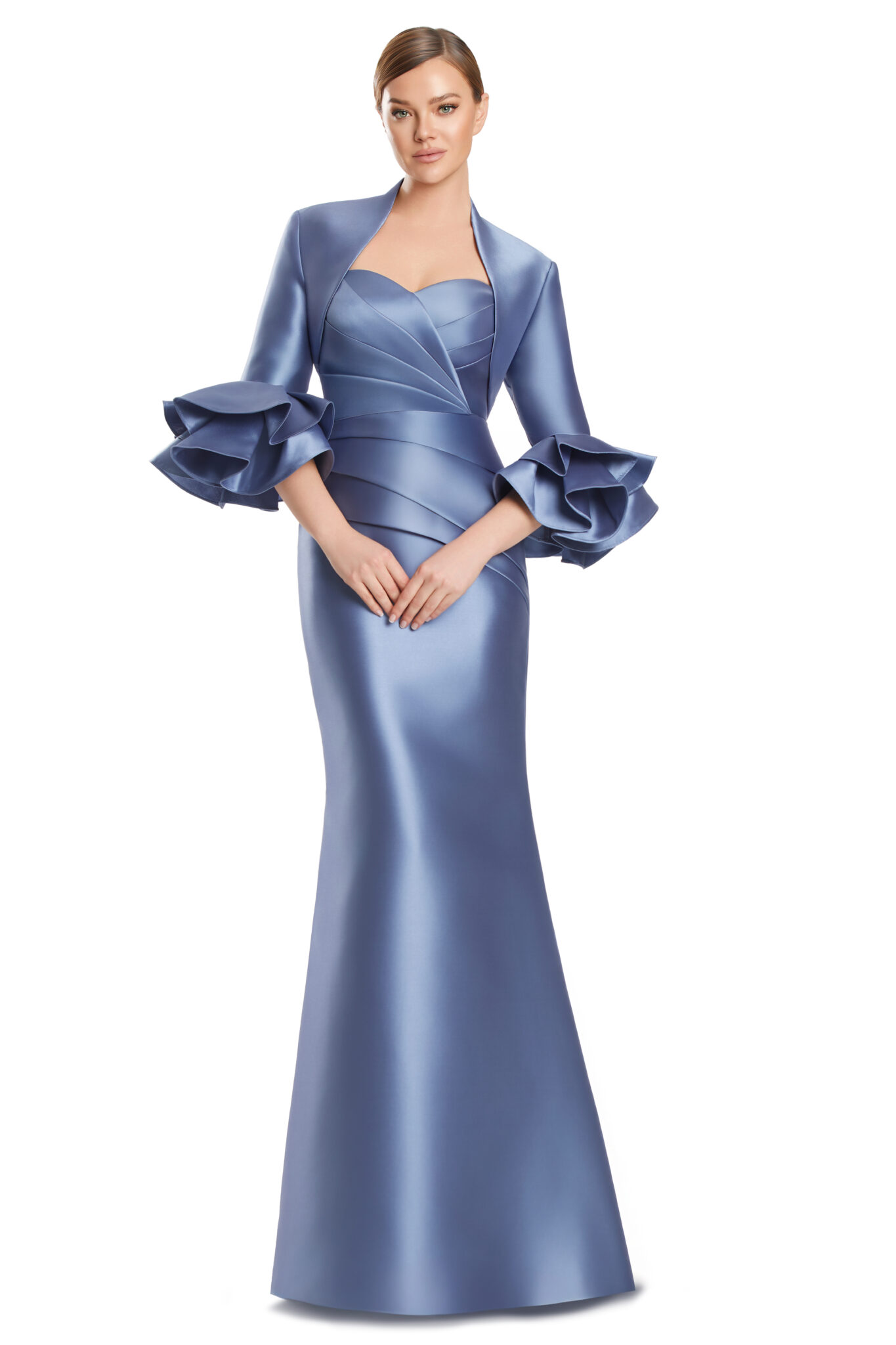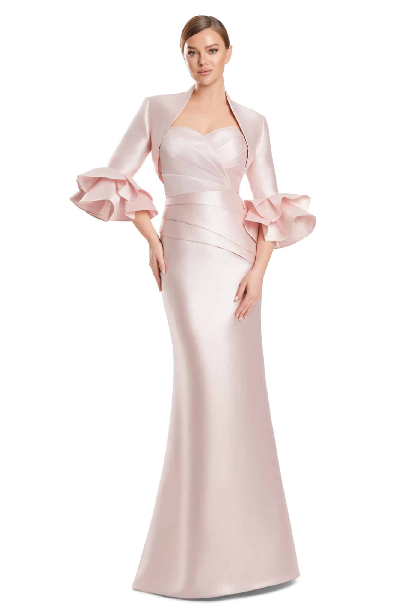 An effortlessly elegant gown that blends structure with softness. Style 3263 features a sculpted strapless bodice with artful pleating that defines the waist and elongates the silhouette, flowing into a sleek, floor-length skirt. A coordinating cropped jacket with dramatic ruffled cuffs adds a sophisticated layer and versatile coverage. Crafted in luxurious satin with a smooth, luminous finish, this timeless design is ideal for mothers of the bride or groom and refined evening occasions.