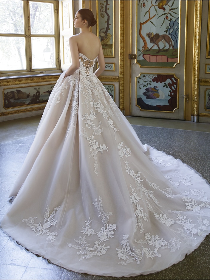 Named after the Queen of the Fairies in Shakespeare’s A Midsummer Night’s Dream, TITANIA is an absolute show-stopper. She features a sculpted bodice with gorgeous sparkling botanical lace and 3D floral motifs cascading down into the grand, 18th century-inspired ball gown organza and tulle skirt modernized with a sexy high slit (and pockets!). This extravagant dream dress brings the drama with detachable, lace off-shoulder sleeves with a cascading ruffled hem to truly give that fairytale princess vibe when walking down the aisle.