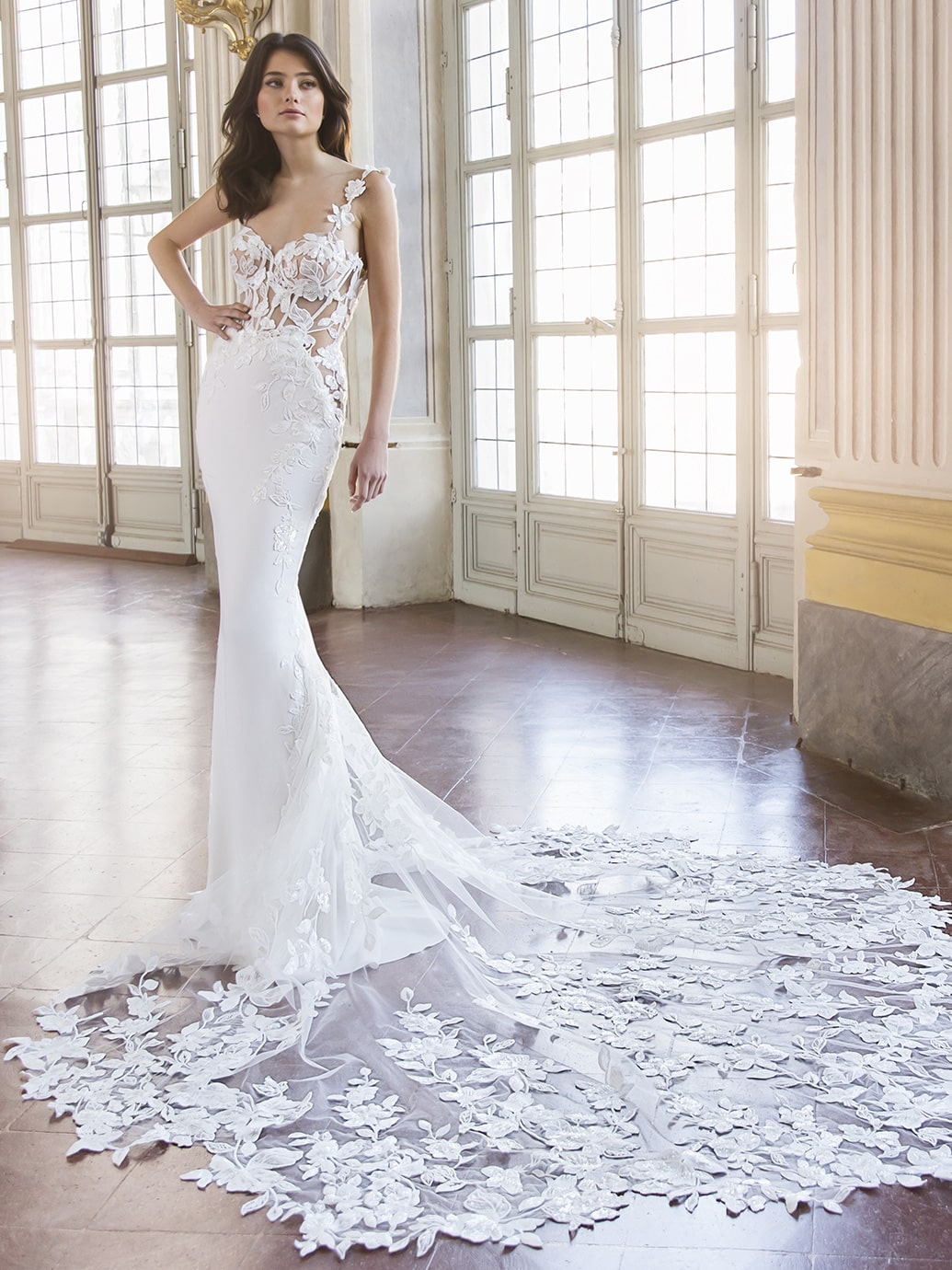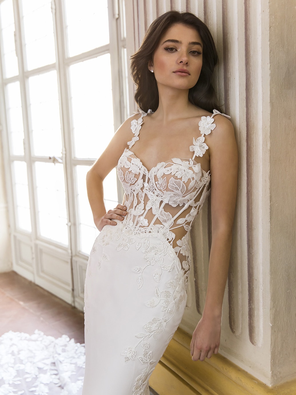 Get ready to stun everyone with this elegant mermaid silhouette! This exquisite gown features a new 3D embroidered lace design with multi-floral motifs on a sweetheart neckline corset bodice. The illusion side cut-outs add a flirty touch, complementing the sleek stretch georgette skirt. The detachable floral straps and sculpted lace train bring a lavish and romantic finish.
