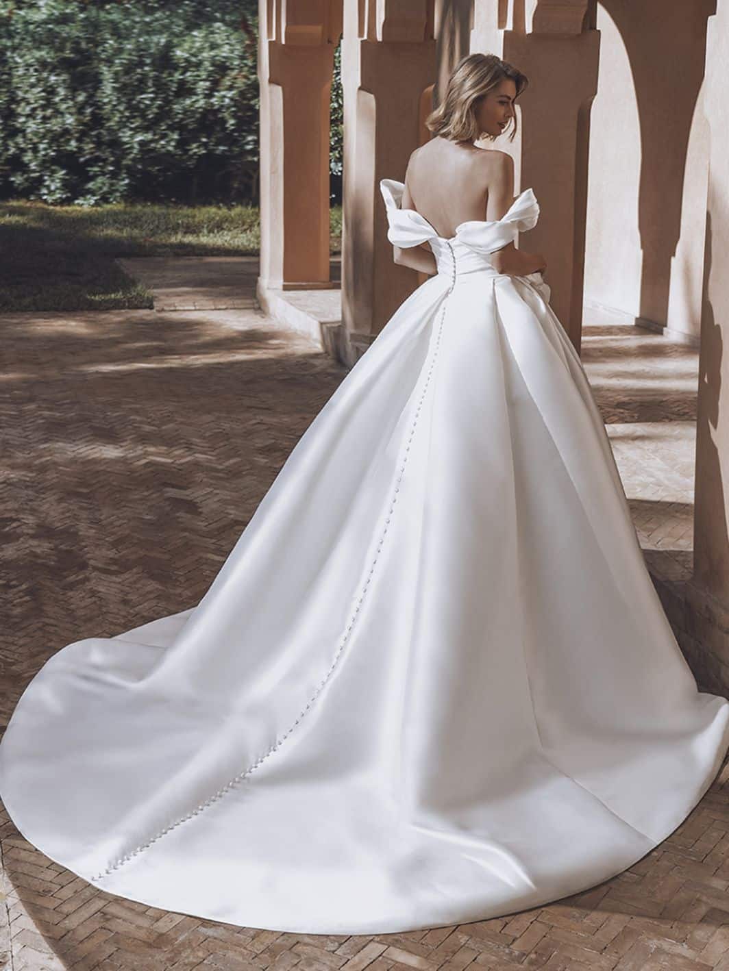 Make a statement in sophistication with this Mikado ball gown dream, ULIANA. This bridal beauty features a romantic sweetheart neckline with detachable off-the-shoulder straps and a voluminous skirt accented with 3D flowers on the waistline. The gorgeous textured draping detail on the bodice flows seamlessly into the pleats of this skirt for a magnificent fairytale effect.