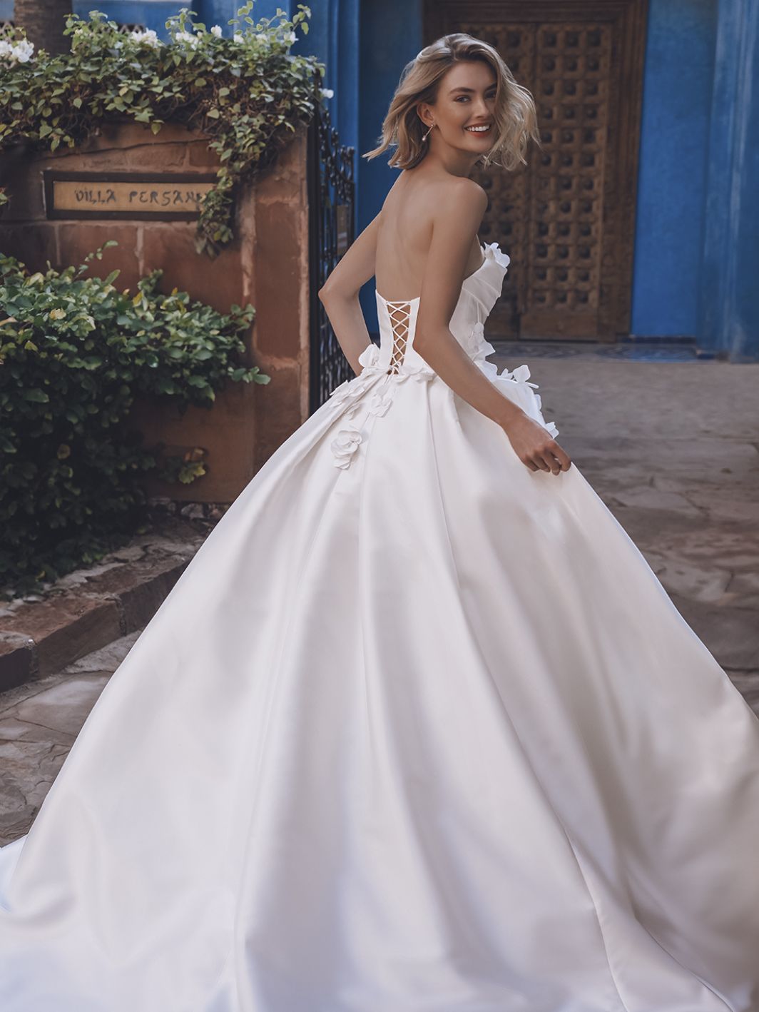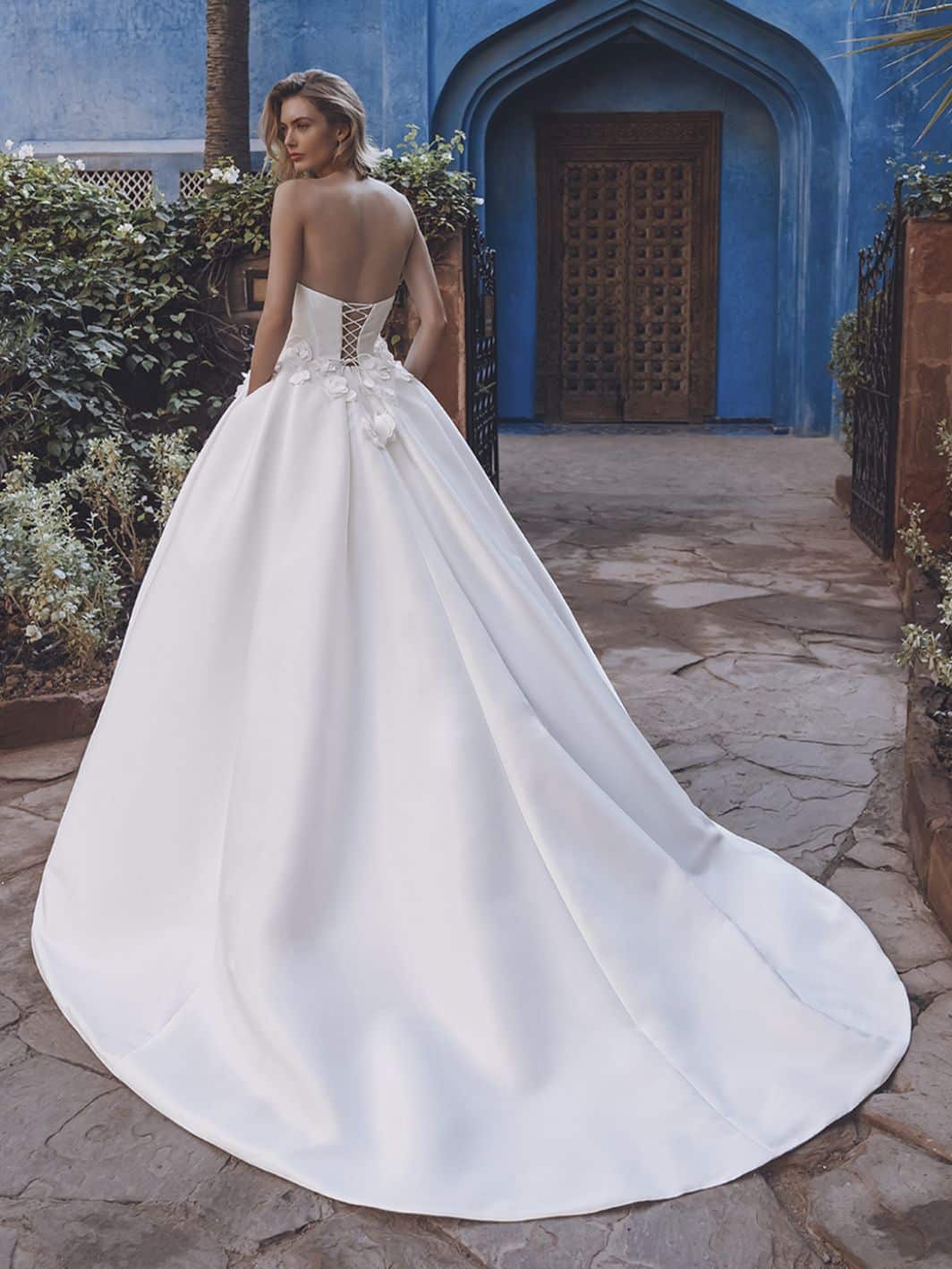 Draw your attention to the UMEKO gown, a stunning Mikado ball gown that epitomizes timeless romance and sophistication. The artfully draped neckline adorned with exquisite 3D flowers exudes ethereal charm and delicate beauty. Continuing the enchantment, the waistline is accented with more of these captivating blooms, adding a whimsical touch to the gown's classic silhouette. Completing the look is a lace-up corset back, not only ensuring a perfect fit but also adding a touch of allure and elegance to this dreamy bridal ensemble.