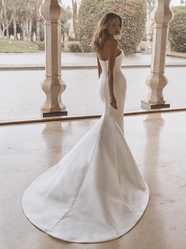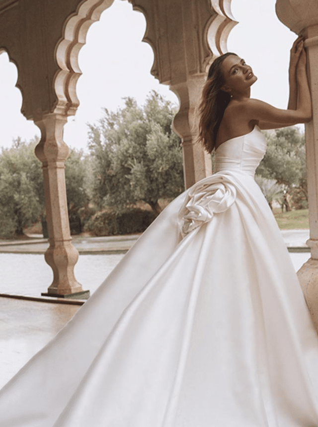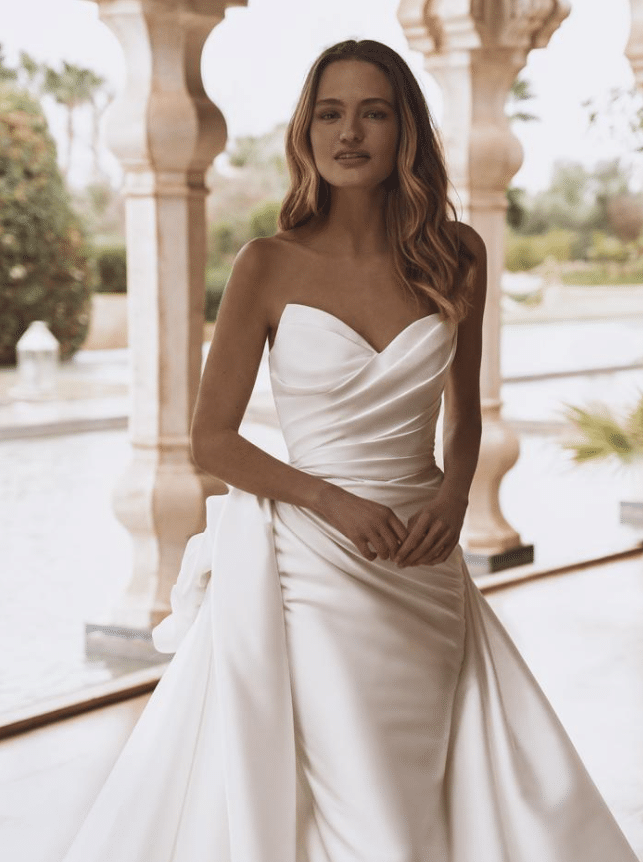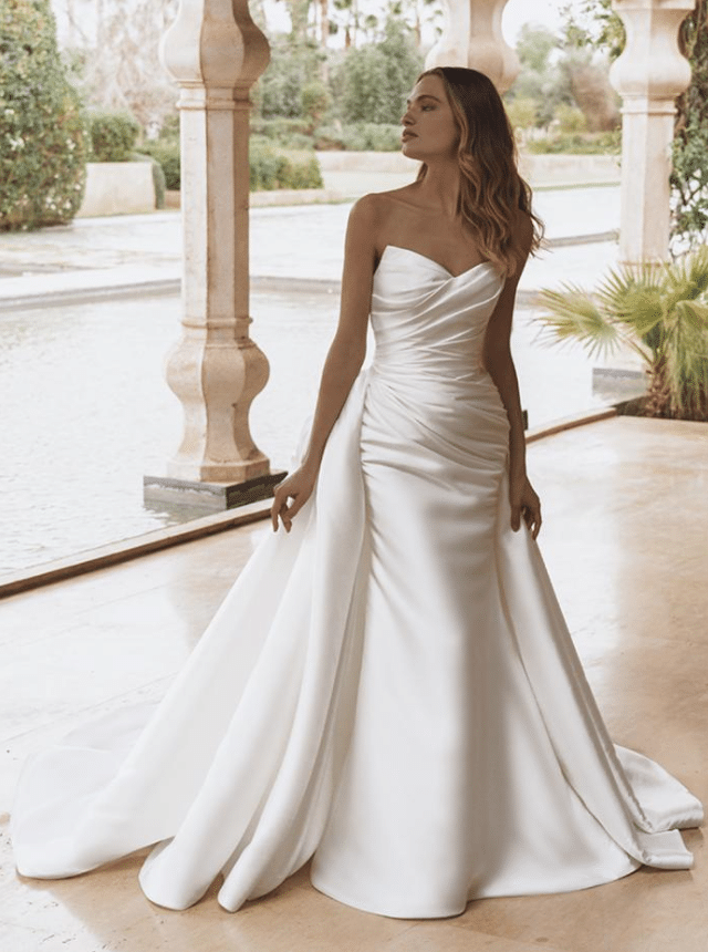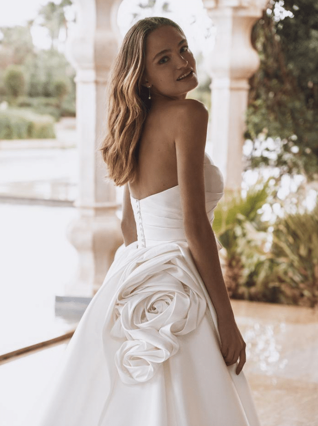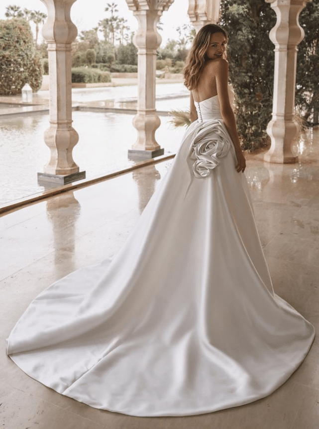Valencia is the perfect blend of contemporary minimalism and sculptural romance. Crafted in luxurious Mikado or satin, this strapless gown features elegant draping across the bodice that flatters the neckline and cinches the waist with graceful precision. The fit-and-flare silhouette is clean and structured, flowing into a sweeping train with a dramatic button detail that trails down the back. A detachable overskirt adds instant drama and volume, accented by a handcrafted floral rosette at the hip—creating a bold, couture-inspired statement. Available in classic Ivory, Valencia is ideal for the bride who wants to radiate timeless elegance with a fashion-forward edge.