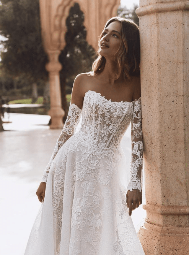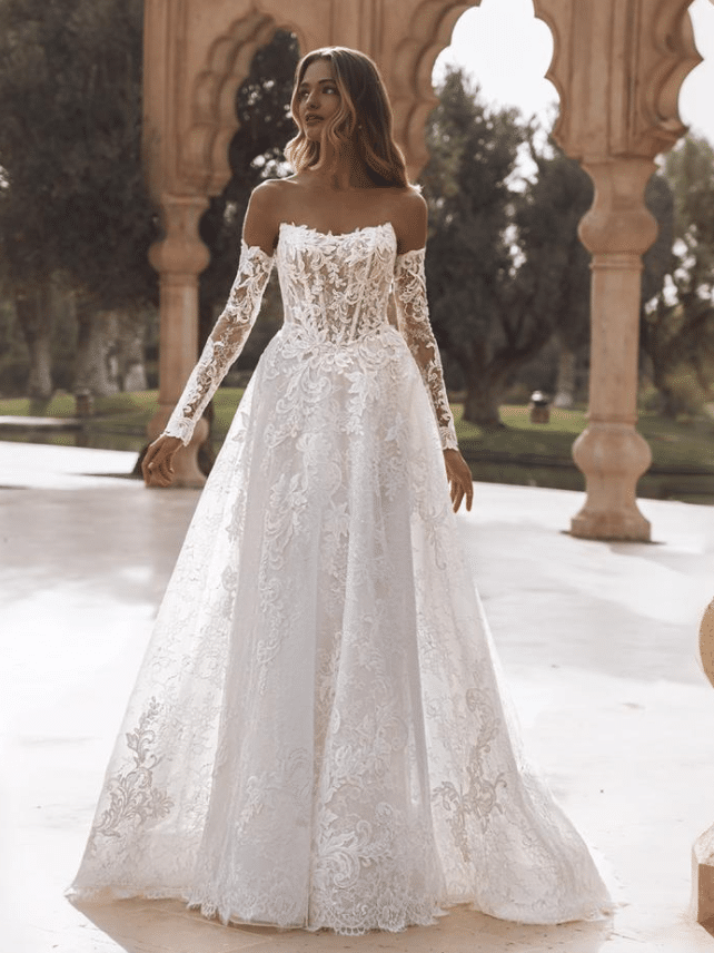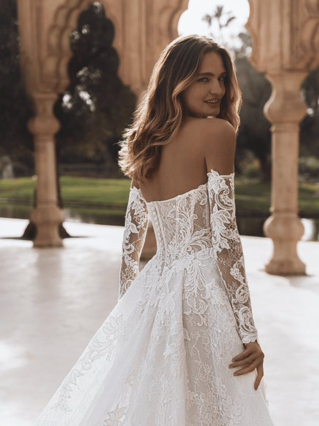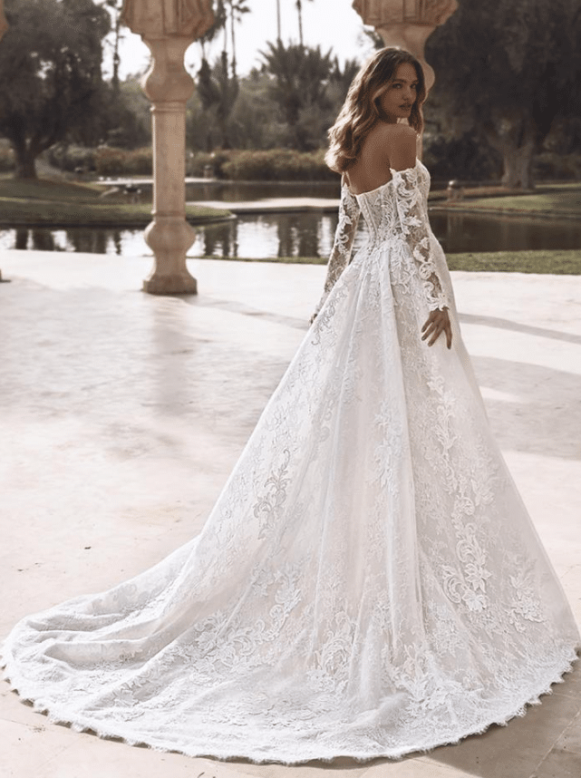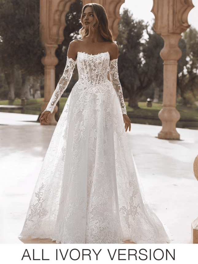 Vanessa is a romantic dream brought to life in layers of shimmering texture and delicate lace. This off-the-shoulder A-line gown features a corset-style bodice adorned with sequinned botanical floral lace and Chantilly lace, offering dimension and detail from every angle. Sheer long sleeves add a touch of ethereal elegance, while the glitter tulle underlay brings subtle sparkle beneath every step. With a flowing tulle skirt and cathedral-length train edged in soft scalloping, Vanessa balances timeless grace with modern bridal luxury. Available in Ivory/Sand/Nude*, Ivory/Ivory/Nude, and Ivory/Ivory/Ivory, Vanessa is perfect for the bride seeking whimsical romance and a truly unforgettable silhouette.