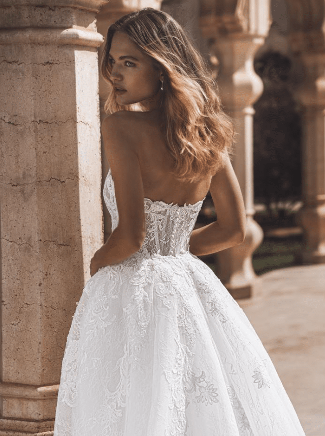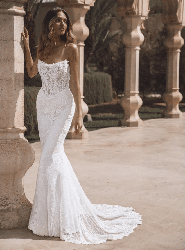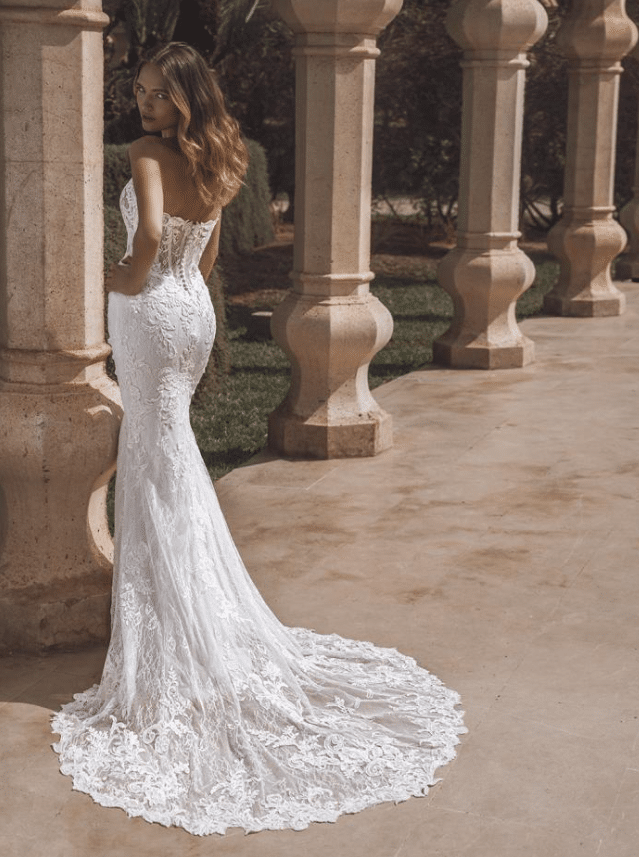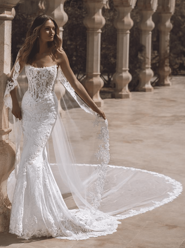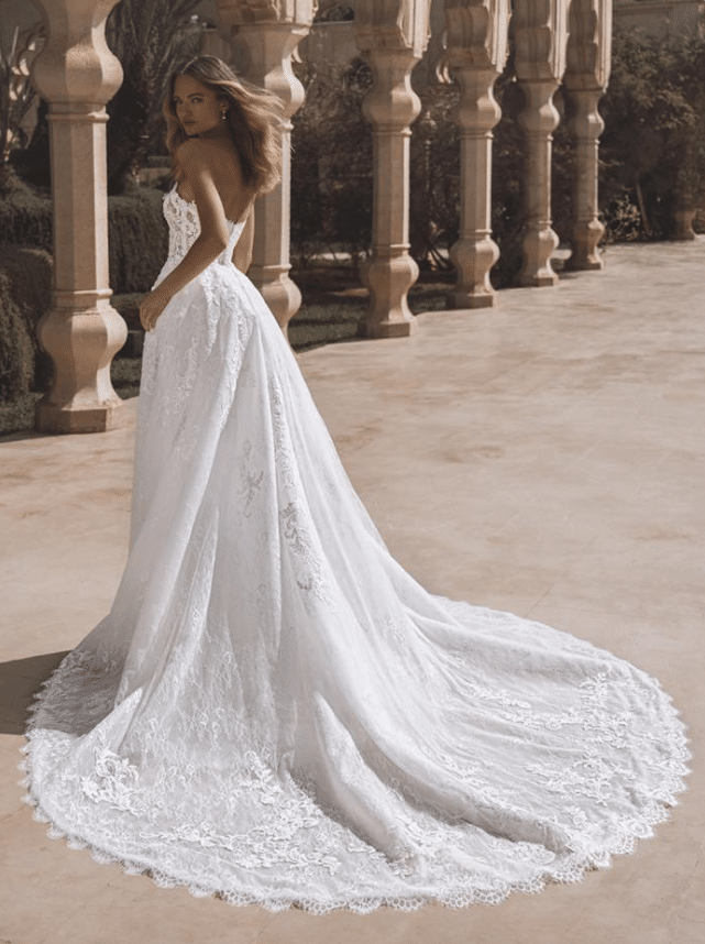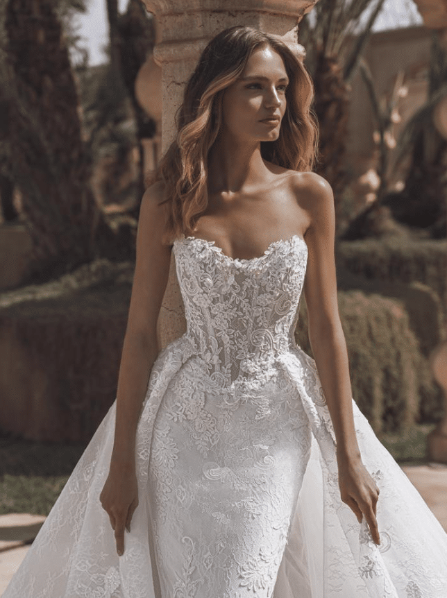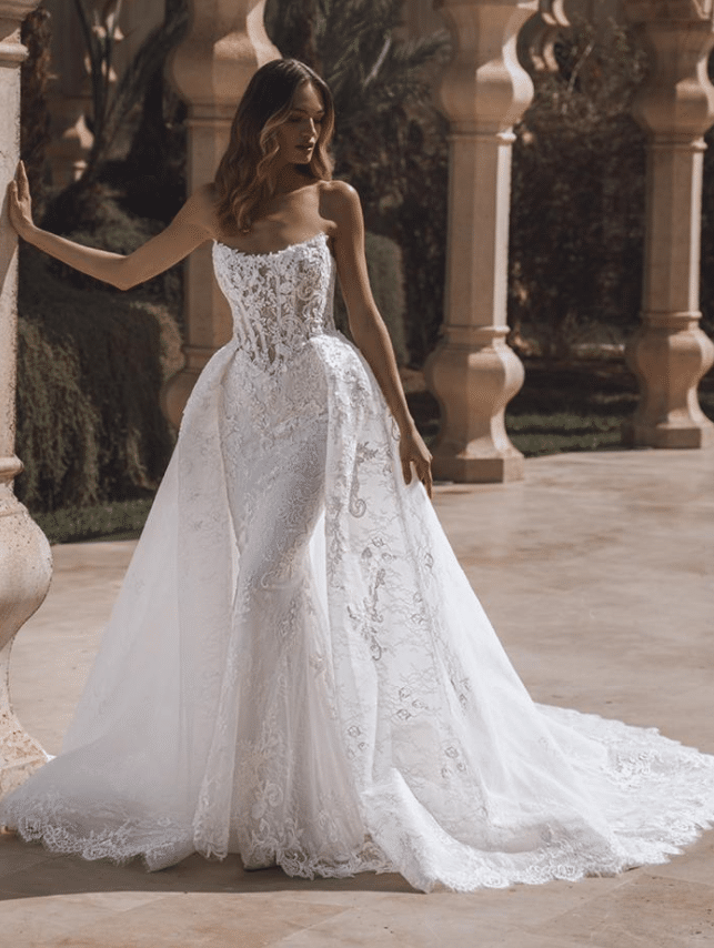 Venice is a breathtaking fusion of timeless lace and red-carpet glamour. This strapless mermaid gown features a sheer corset bodice adorned with 3D pearl-beaded flowers and layers of sequined corded lace and Chantilly lace, creating a luxurious texture that shimmers with every movement. A soft, romantic sweetheart neckline balances the bold structure of the silhouette, while the delicate lace-edged train adds a dramatic, feminine finish. A detachable lace overskirt transforms the look into a regal ballgown, offering two stunning styles in one unforgettable gown. Available in Ivory/Nude* and Ivory/Ivory, Venice is for the bride who dreams of couture-level detail with the freedom to own every moment.