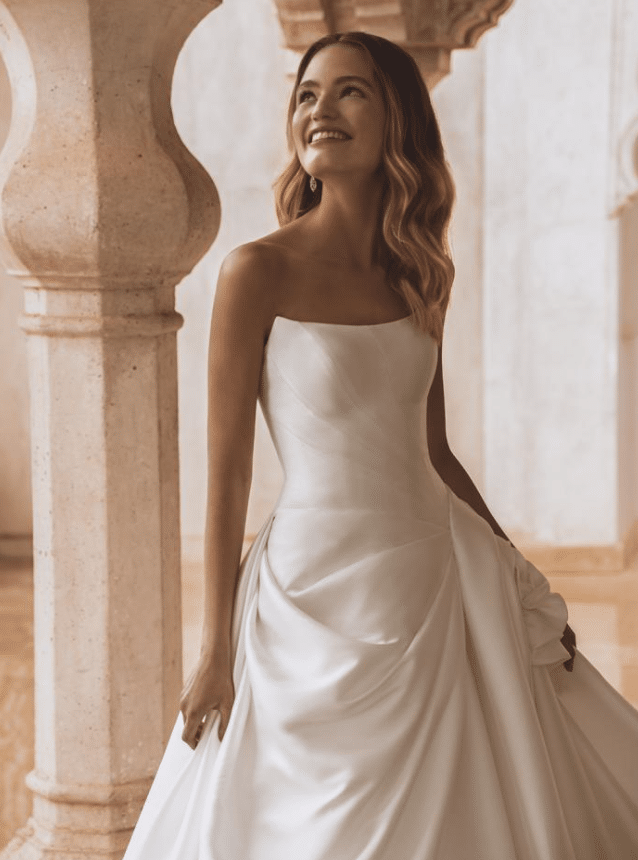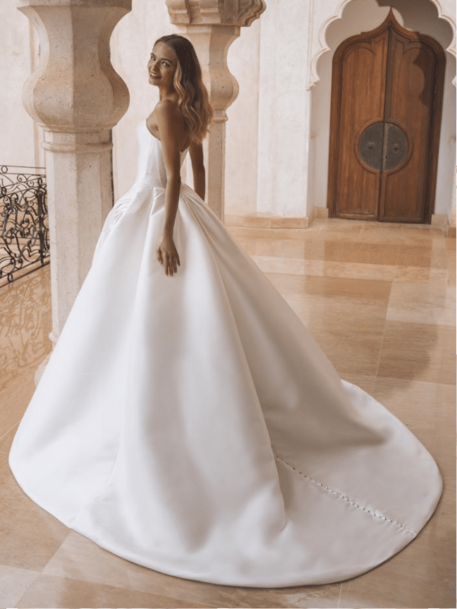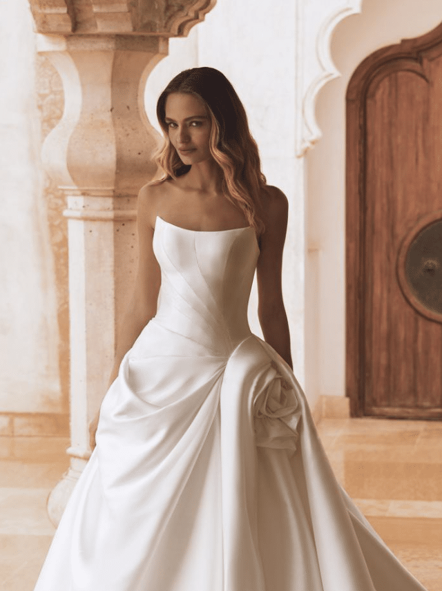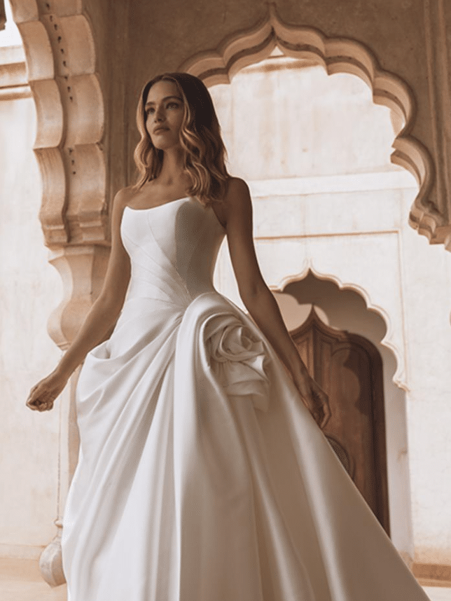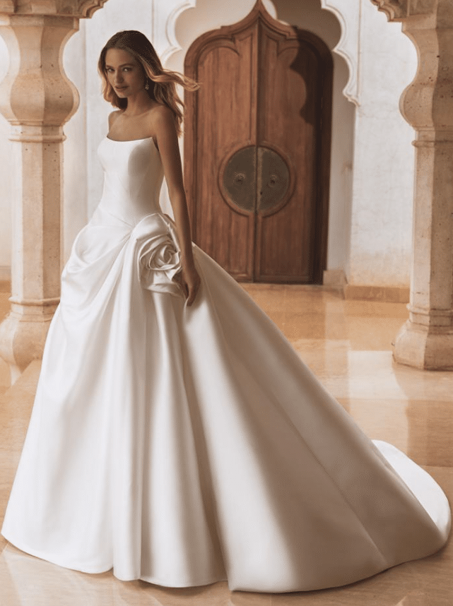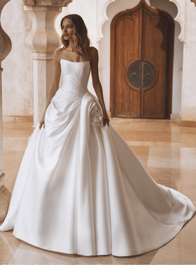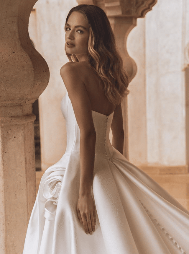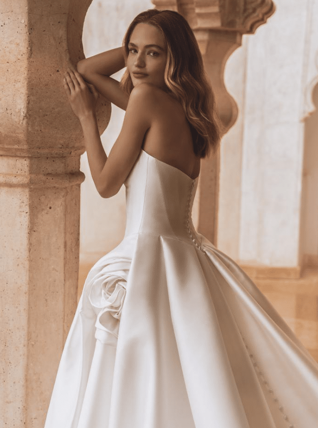 Vera is a sculptural work of art, designed for the bride who seeks regal sophistication with a contemporary edge. Crafted from lustrous Mikado or satin, this strapless ballgown features a structured bodice with subtle geometric pleating for a modern touch. The standout detail—a handcrafted oversized floral accent at the hip—adds couture drama and romantic flair. The voluminous skirt cascades into a sweeping train finished with elegant buttons trailing down the back, ensuring a breathtaking view from every angle. Offered in a rich Ivory, Vera is timeless elegance reimagined with architectural beauty and high-fashion charm.
