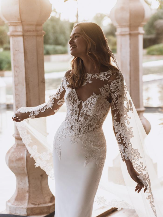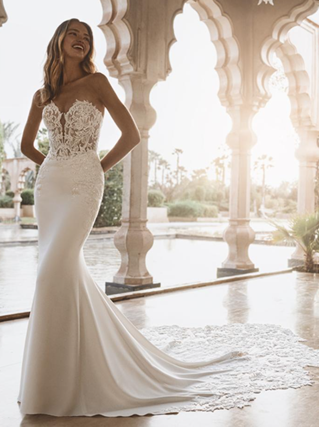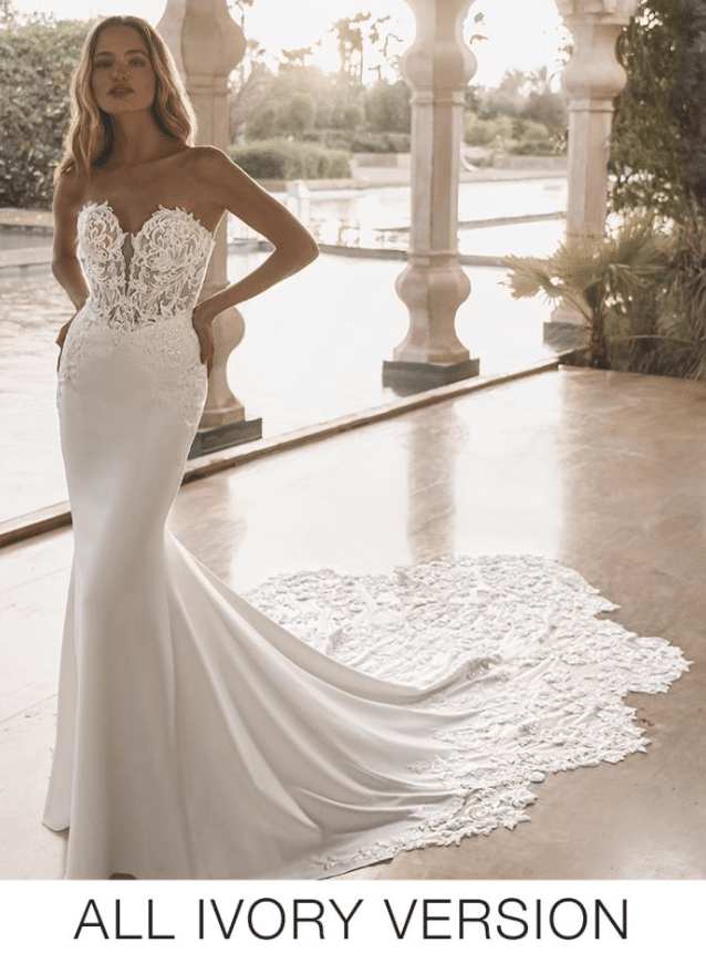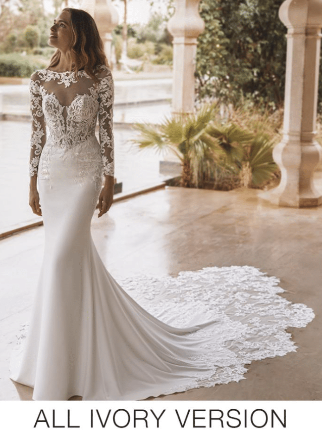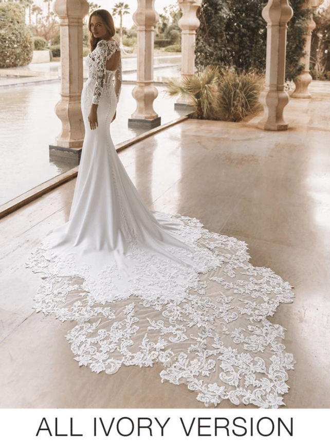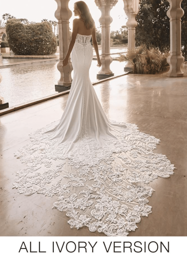 Vienna is the definition of timeless sophistication with a modern twist. This fit-and-flare gown features a stunning illusion bodice adorned with sequinned floral embroidered lace, offering the perfect balance of sparkle and structure. Crafted in luxe crepe, the skirt glides seamlessly over the silhouette and extends into a show-stopping lace-edged cathedral train for an unforgettable finish. Vienna also includes detachable illusion lace sleeves for a versatile look that transitions effortlessly from ceremony to reception. Whether worn strapless or with the sleeves, this gown is pure bridal elegance. Available in Ivory/Nude* and Ivory/Ivory, Vienna is for the bride seeking grace, glamour, and breathtaking detail from every angle.