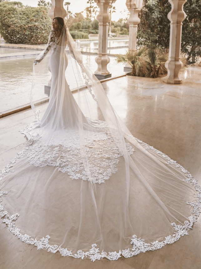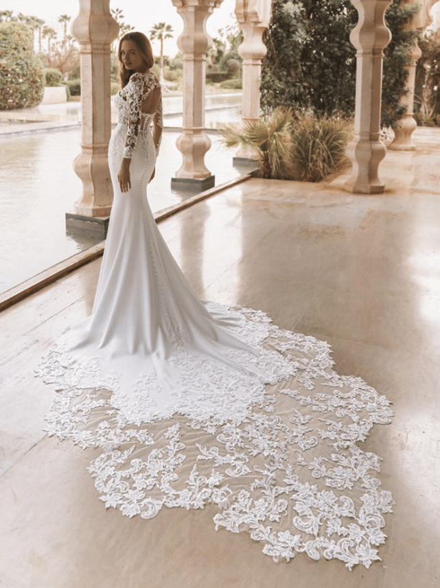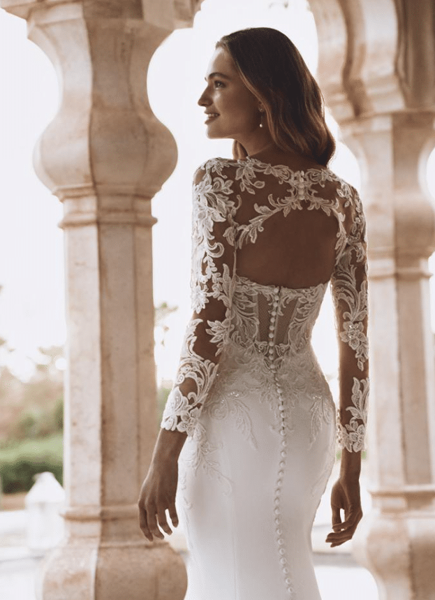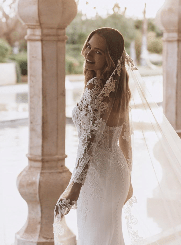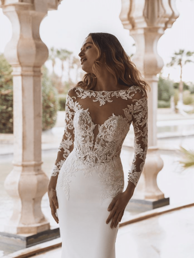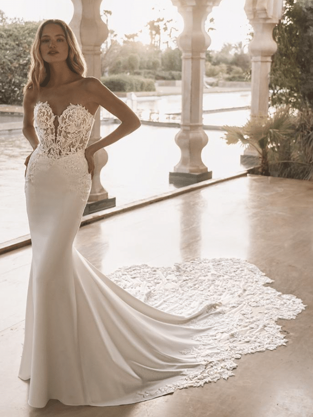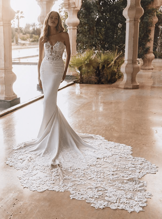Vienna is the definition of timeless sophistication with a modern twist. This fit-and-flare gown features a stunning illusion bodice adorned with sequinned floral embroidered lace, offering the perfect balance of sparkle and structure. Crafted in luxe crepe, the skirt glides seamlessly over the silhouette and extends into a show-stopping lace-edged cathedral train for an unforgettable finish. Vienna also includes detachable illusion lace sleeves for a versatile look that transitions effortlessly from ceremony to reception. Whether worn strapless or with the sleeves, this gown is pure bridal elegance. Available in Ivory/Nude* and Ivory/Ivory, Vienna is for the bride seeking grace, glamour, and breathtaking detail from every angle.