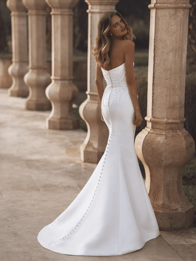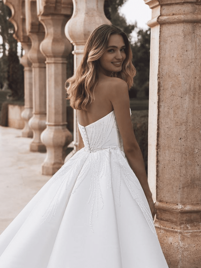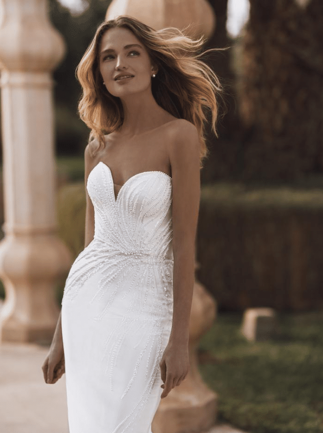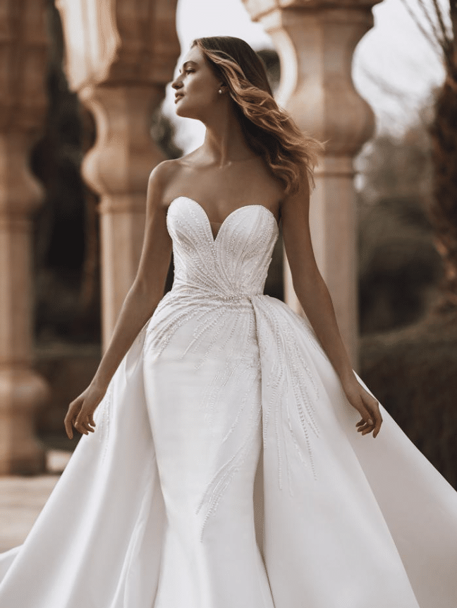 Virginia is a breathtaking blend of elegance and modern drama. This strapless gown stuns with its sculpted sweetheart neckline and a fit-and-flare silhouette, elevated by radiant pearl-beaded sequin trim that fans out across the bodice like rays of light. Crafted in luxe Mikado or satin, Virginia hugs the body in all the right places before flaring into a clean, dramatic train for an unforgettable exit. The detachable overskirt adds a regal ballgown effect—perfect for transitioning from ceremony to reception. Available in classic Ivory, Virginia is a captivating choice for the bride who wants the best of both worlds: sultry sophistication and timeless grandeur.