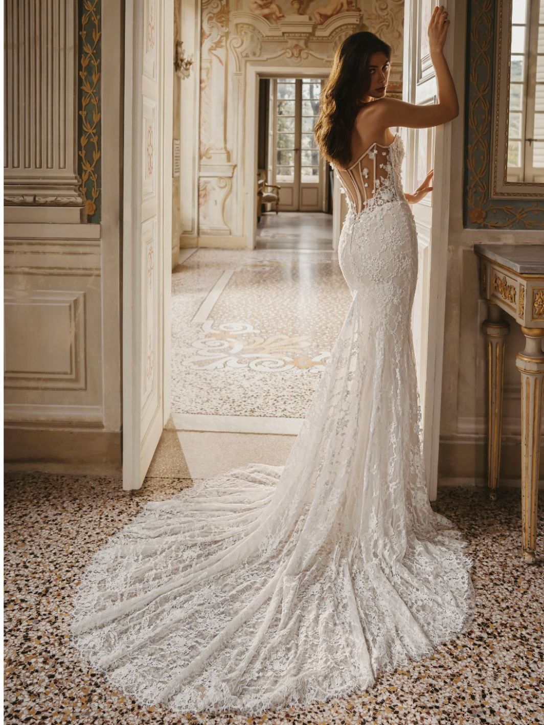 Winnie by Enzoani is a romantic fit-and-flare gown featuring a sculpted strapless bodice adorned with delicate beaded Chantilly lace and dimensional 3D floral appliqués. Layers of glitter tulle and soft tulle create subtle shimmer and movement, while the elegant silhouette flows into a graceful lace-trimmed train.